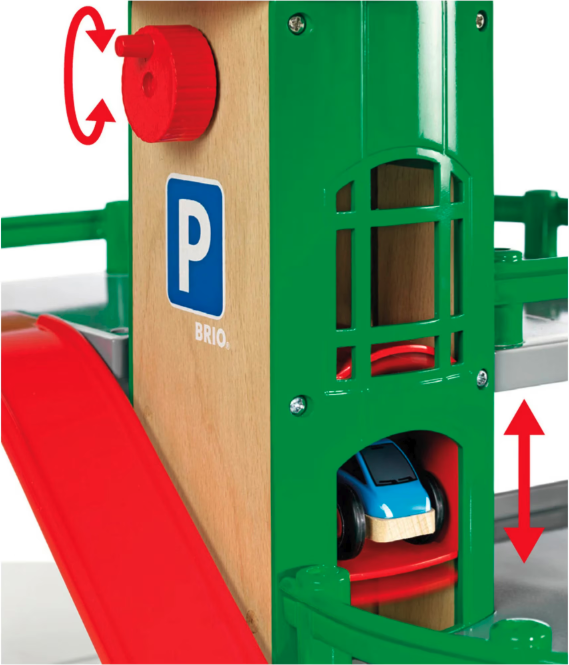 Parcare supraetajata - BRIO, cu lift si tobogan. Include 2 masinute si un vagon cu platforma. Conectati calea ferata si drumurile din lume BRIO cu parcarea supraetajata.