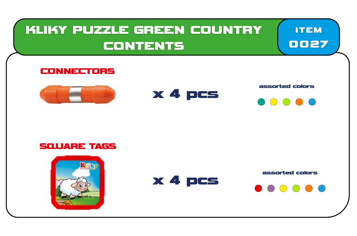Pe masura ce isi dezvolta intelegerea modului in care functioneaza Kliky, vor incepe sa inteleaga conceptele implicate in constructia tridimensionala, ceea ce le va permite sa realizeze constructii din ce in ce mai complexe. Dupa ce bazele sistemului Kliky au fost stapanite, copilasul va incepe sa descopere si placutele colorate cu imagini (animale de la ferma) si isi va insusi noi concepte.