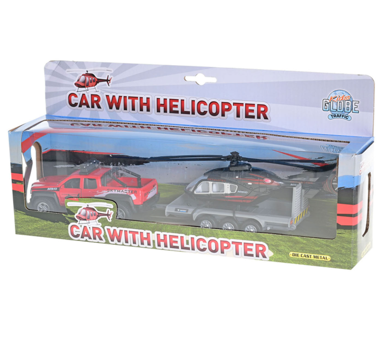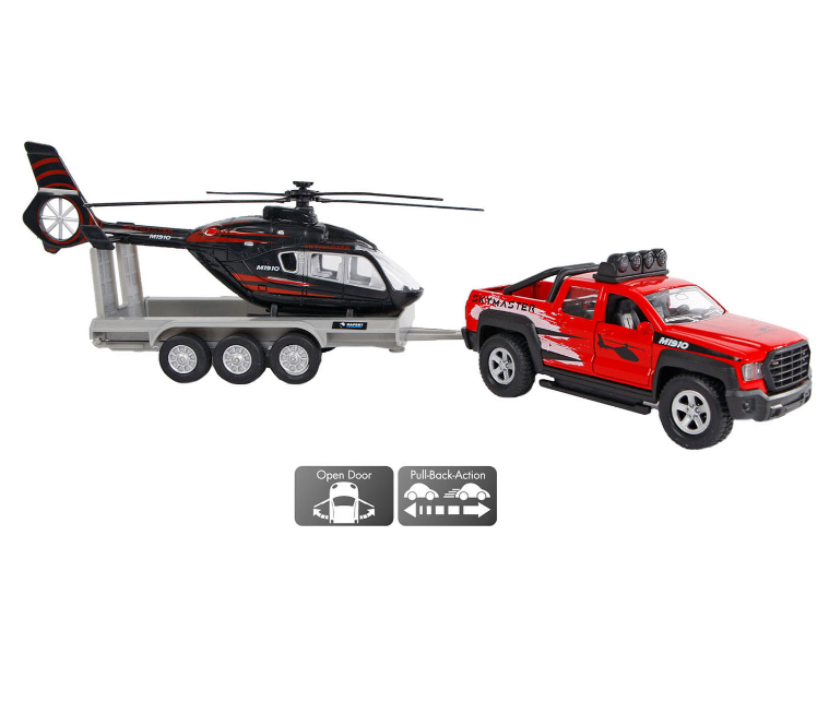 Vehicul de teren cu remorcă și elicopter. Usile se pot deschide. Dimensiune set: 35 cm lungime.