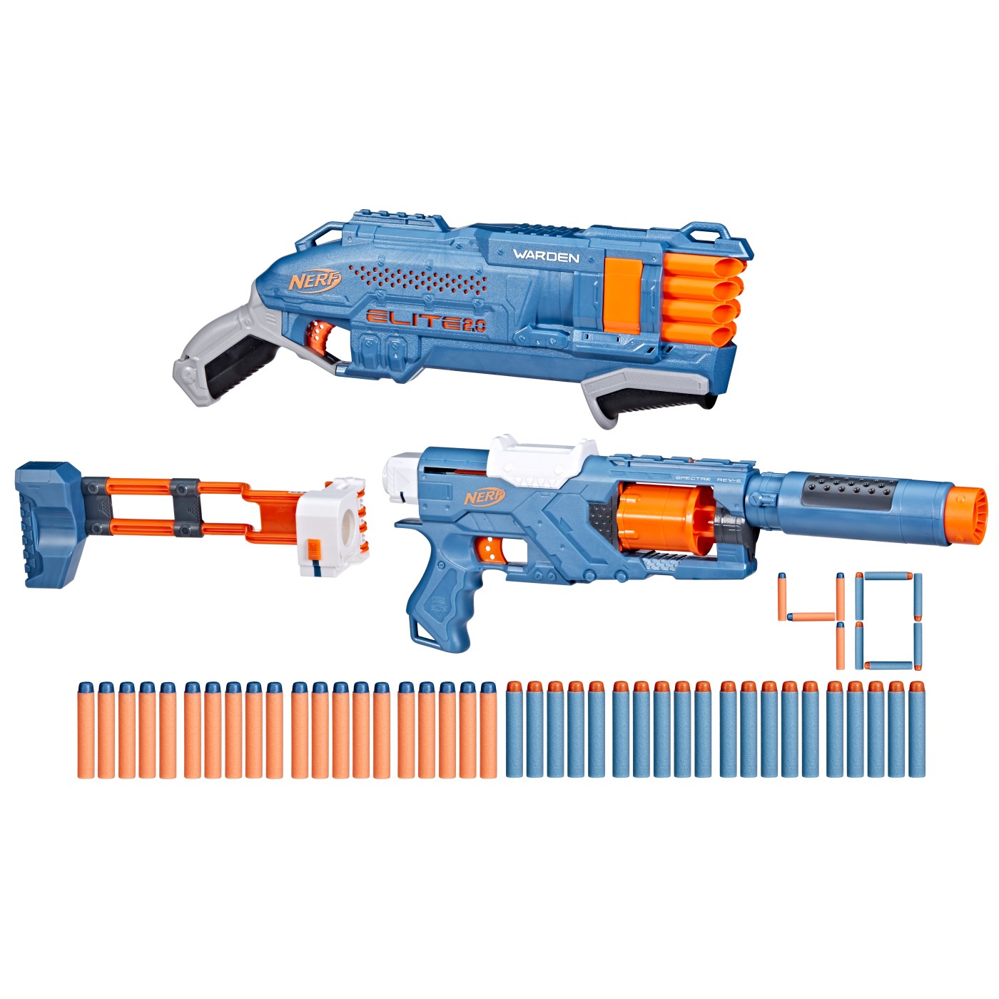 Acest pachet cu 2 blastere este o modalitate excelenta de a incepe sau de a construi colectia ta Nerf! Este un set cadou perfect. si cu 2 blastere, batalia poate incepe imediat din cutie. Creeaza 6 stiluri diferite de blaster cu blasterul Spectre Rev-5! Are un cilindru rotativ cu 5 sageti, prelungire a tevii detasabila, material pliabil detasabil si sina tactica. Acest set impresionant Nerf Elite 2.0 include blasterul Spectre Rev-5, blasterul Warden DB-8 si 40 de sageti cu spuma Nerf Elite. Acest pachet include 40 de sageti! Ai suficient pentru a incarca complet ambele blastere si multe altele pentru a reincarca rapid si a continua sa lupti.