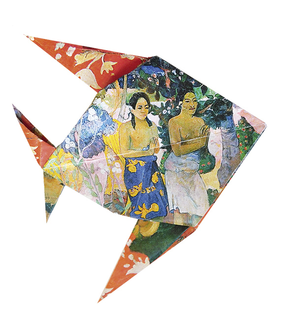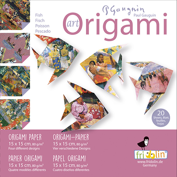 Set ce conține 20 de coli de hârtie de dimensiunea 15 x 15 cm cu 4 modele diferite inspirate de creațiile lui Paul Gauguin, speciale pentru confecționarea de pești origami.