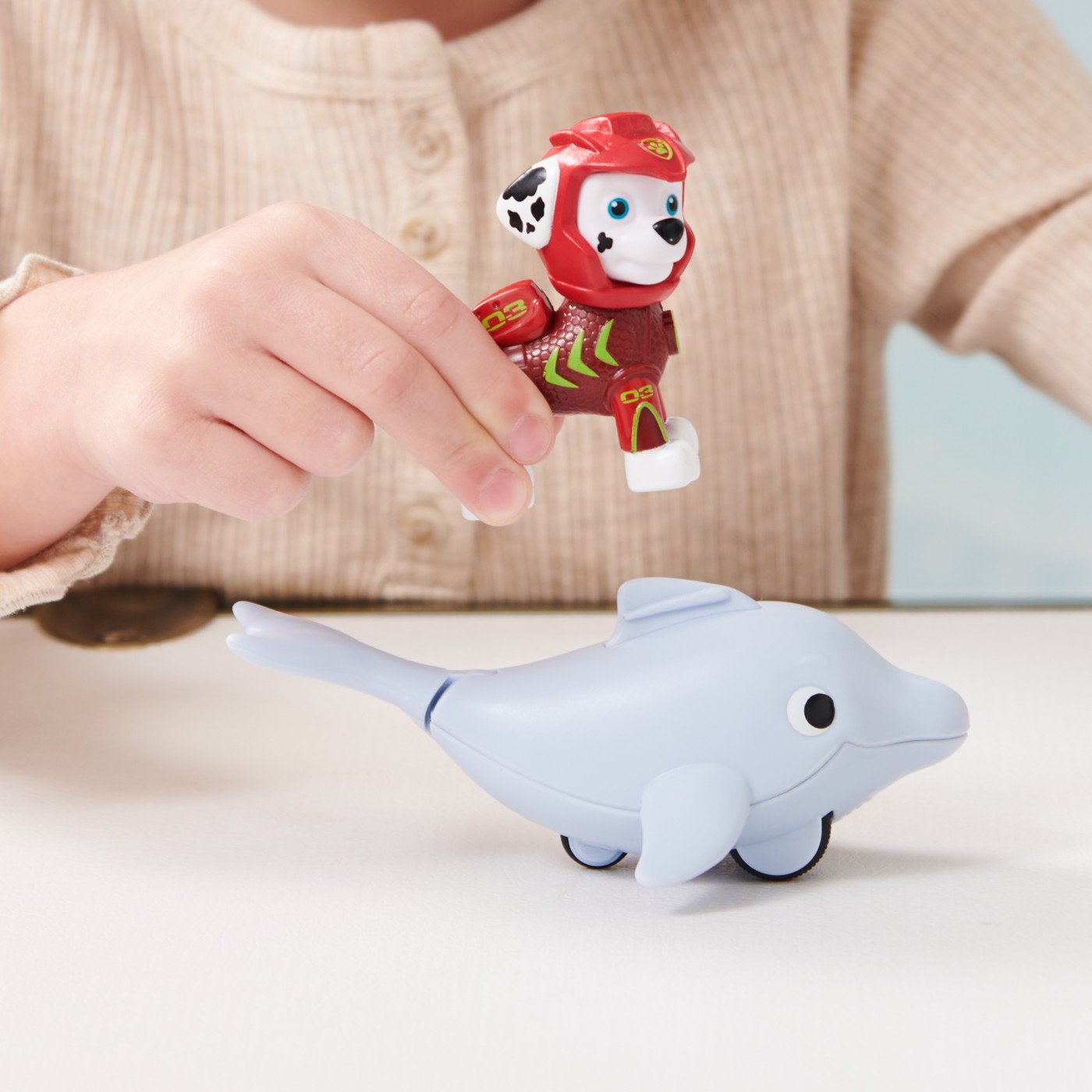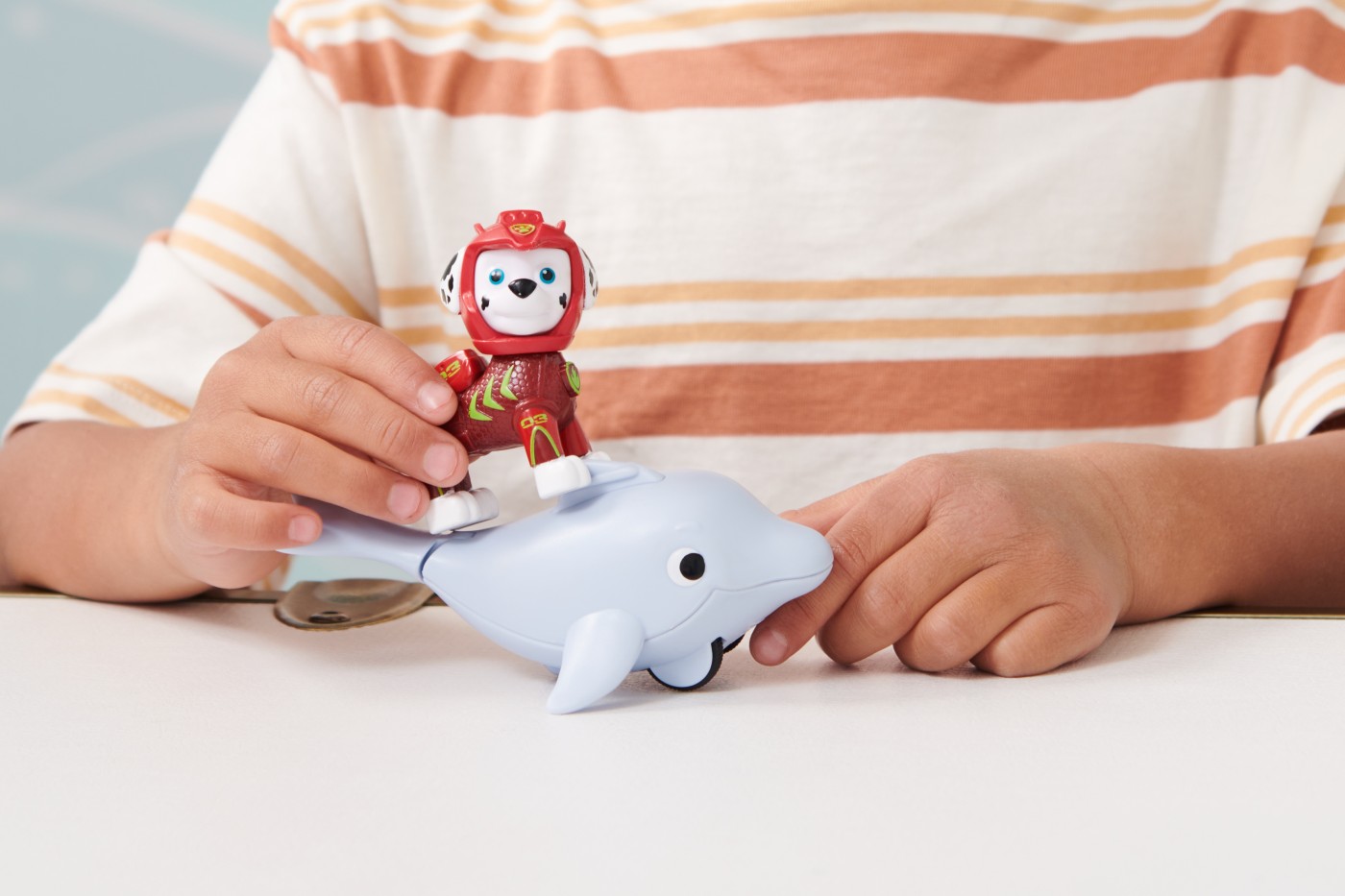 Pregateste-te pentru aventuri de salvare incitante pe mare alaturi de catelusii tai preferati si noii lor prieteni acvatici si insoteste-i in misiuni de salvare incitante cu ajutorul cateilor din Patrula Catelusilor, Catelusii Acvatici. Acest set de figurine de actiune ii includ pe catelusi, in noile uniforme de neopren, si pe prietenii sai de incredere . Îndragitii catelusi din Patrula Catelusilor sunt gata sa plece in actiune. Ataseaza-i pe catelusi pe aripioarele de pe spatele rechinului si roteste rechinul inainte pentru a-i activa muscatura de rechin, in timp ce pleci in misiunea de salvare si devii eroul zilei. Cu detalii autentice si un stil original, acest set minunat inglobeaza toata distractia subacvatica din serialul TV de succes. Pentru misiuni si mai interesante inspirate din serial, colectioneaza toate figurinele si vehiculele de jucarie Patrula Catelusilor, Catelusii Acvatici, alaturi de vehiculul de echipa Whale Patroller/Patrulatorul Balena (fiecare vandut separat) pentru ore nesfarsite de aventuri pline de actiune. Cu jucariile Patrula Catelusilor, copiii isi pot explora imaginatia si isi pot dezvolta abilitatile motorii, prin jocuri de simulare, in timp ce aduc la viata scenele preferate din serial. Figurinele de actiune, masinile de jucarie, seturile de joaca si animalele de plus Patrula Catelusilor sunt jucariile perfecte pentru baietii si fetele cu varsta de cel putin 3 ani. Ia acasa chiar astazi aventura Patrula Catelusilor: Catelusii Acvatici. Acest pachet contine persoanejele: Marshall si Delfinul.