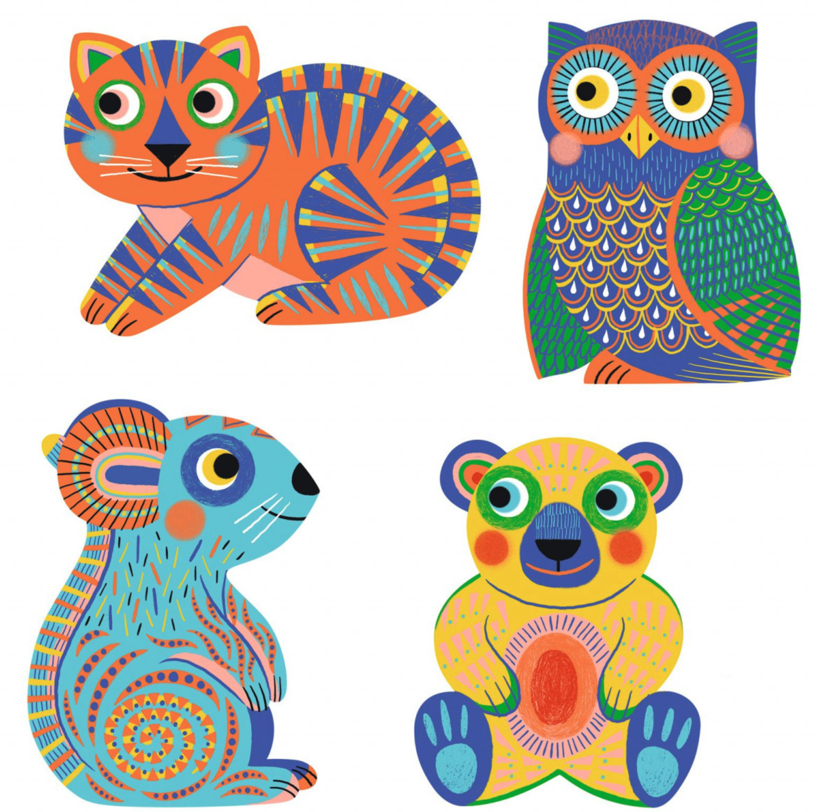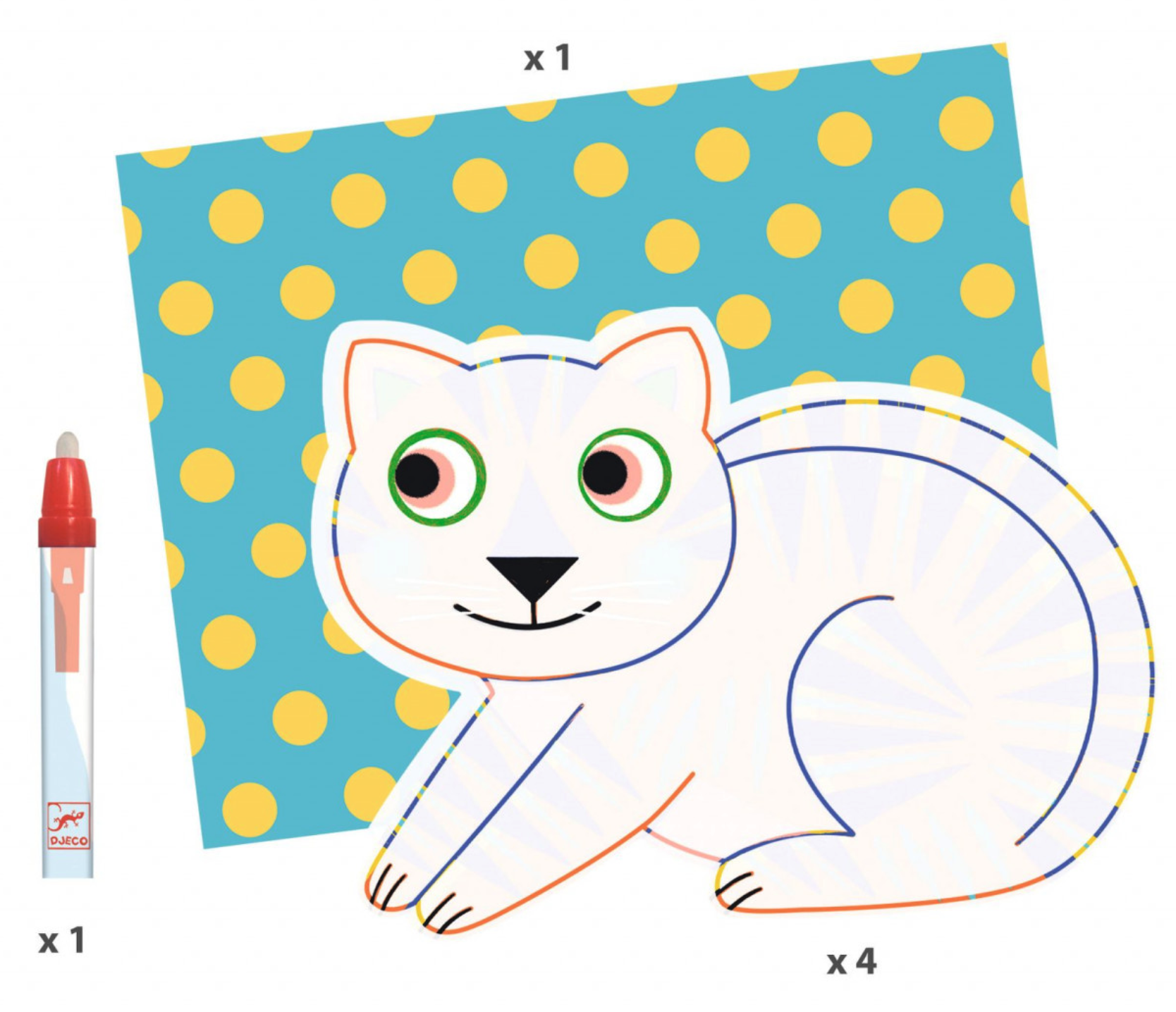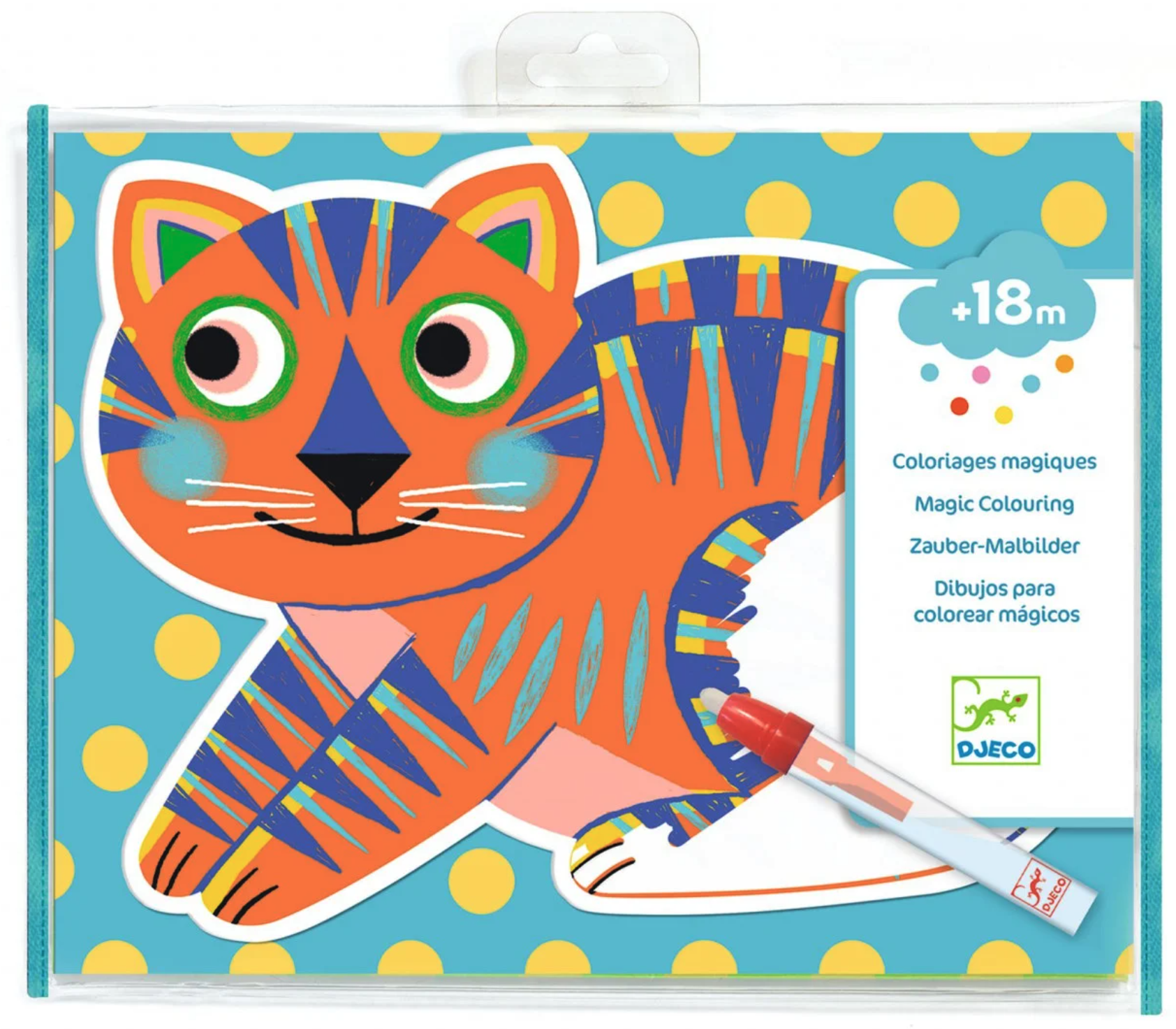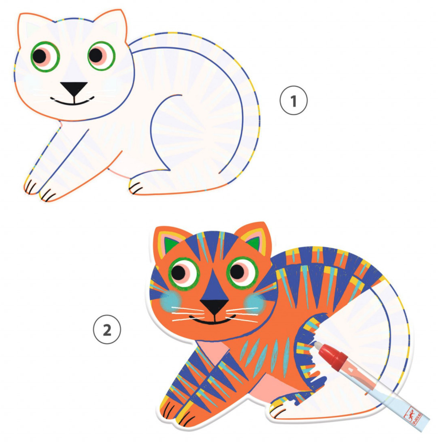 Setul conține 4 planșe ( 26 x 20 cm) preilustrate din plastic flexibil, cu o zonă albă care dispare odată udată și culorile de sub ies la iveală, 1 ”stilou” gros cu rezervor pentru apă, potrivit pentru mânuțe mici. Odată ce sunt udate cu apă, planșele dau impresia că cei mai mici artiști au colorat; după uscare, joaca începe iar, planșele fiind reutilizabile.