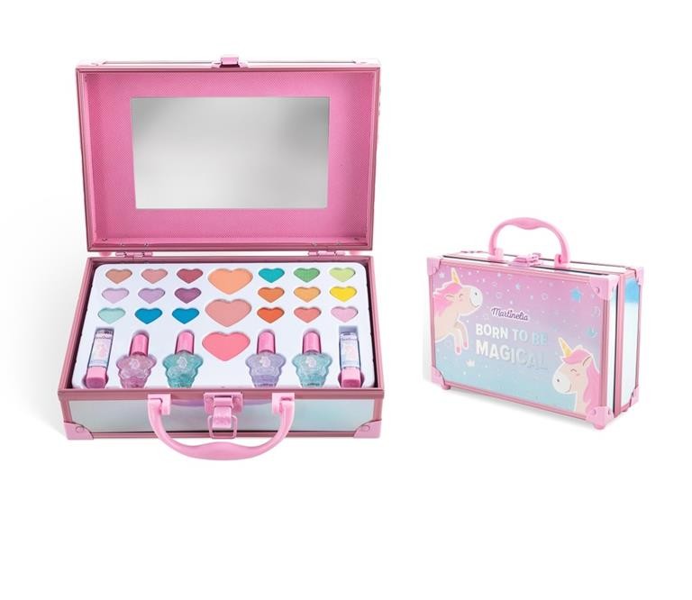 Cu aceasta trusa uimitoare, cei mici vor simti magia unicornului! Toate elementele esentiale pentru o dupa-amiaza distractiva si creativa, 18 farduri de pleoape in toate culorile curcubeului, 4 lacuri de unghii cu sclipici, 3 farduri de obraz si 2 rujuri, cu oglinda inclusa!