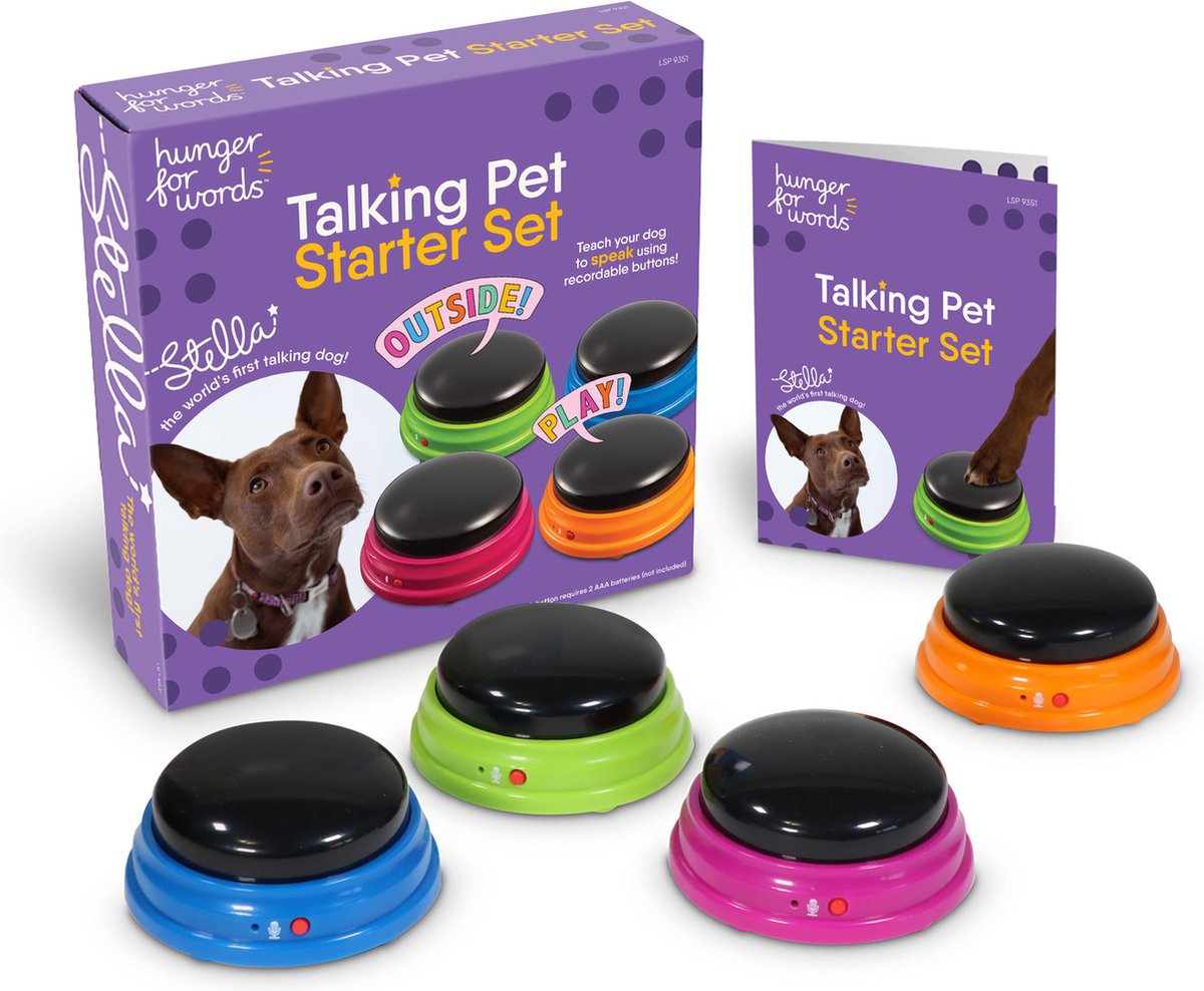 Cu această jucărie, vă puteți învăța câinele să vorbească cu butoanele la îndemână, auto-înregistrate și cu manualul de instrucțiuni. Hunger for Words a fost fondată de Christina Hunger, un logoped care a văzut multe dintre caracteristicile cățelușului ei Stella pe care le vede și la copiii mici chiar înainte de a începe să vorbească. Butoanele de vorbire Hunger for Words combină psihologia animală, patologia vorbirii și AAC (Comunicare Augmentative și Alternative) într-un joc educațional și distractiv în care câinele învață să-și facă auzită vocea. Setul de pornire constă din patru butoane de vorbire care trebuie rostite singur. Începutul ideal pentru această aventură vorbăreț! Pachetul include un manual scris de Christina Hunger pentru un început bun.
