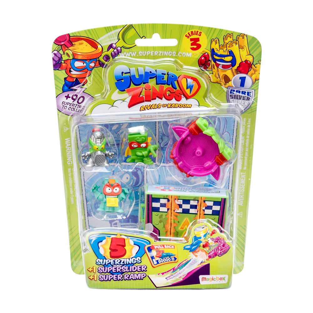 Seria 3 contine peste 90 de figurine SuperZings de colectionat! SuperZings sunt obiecte obisnuite care se transforma in super eroi si super raufacatori. Completeaza-ti colectia din seria 3 SuperZings cu acest set cu 5 figurine, 1 super slider si o rampa pentru salturi incredibile. Setul ofera ore intregi de distractie si joaca cu curse de masini, lanseaza pe rampa super sliderul inclus sau orice alt super slider din seria 3 SuperZings (fiecare se vinde separat) si invita-ti toate personajele preferate la distractie. Oare ce super slider este mai rapid? Fa-i pe eroi si pe raufacatori sa se intreaca si vezi cine castiga marea cursa! Printre cele 5 figurine care se regasesc in set, vei gasi 4 personaje SuperZings (eroi si raufacatori) si o figurina rara silver.