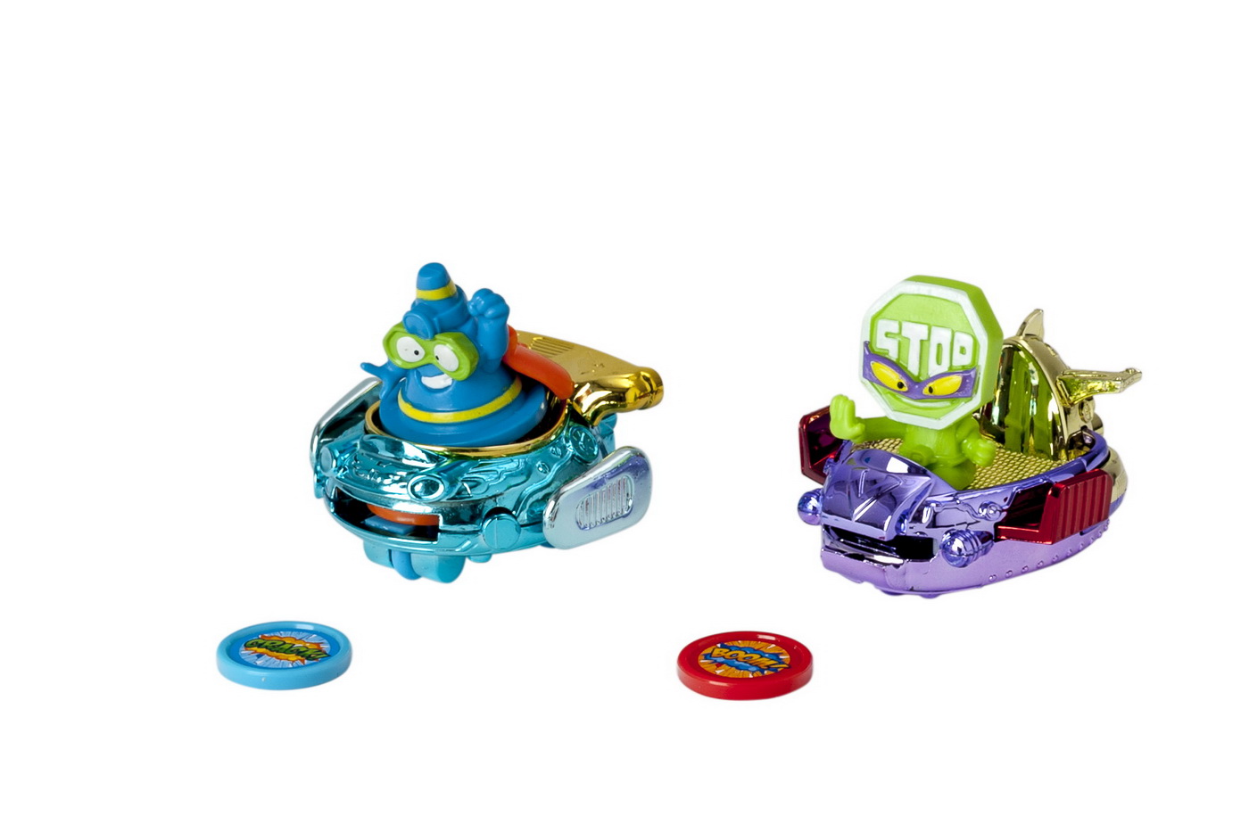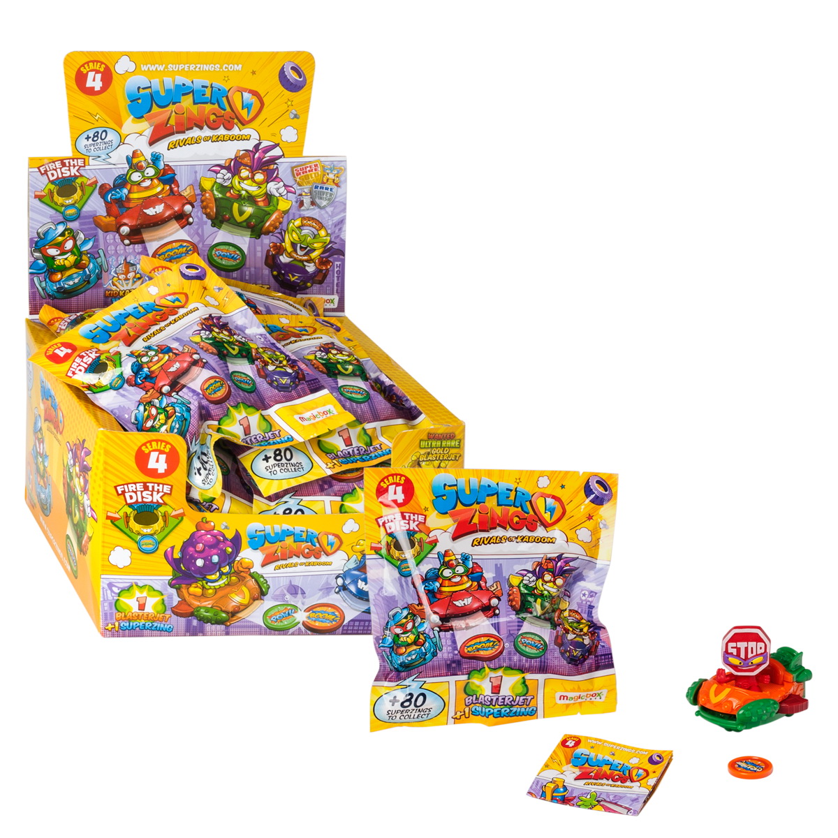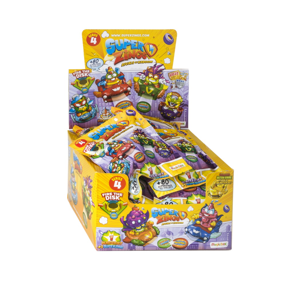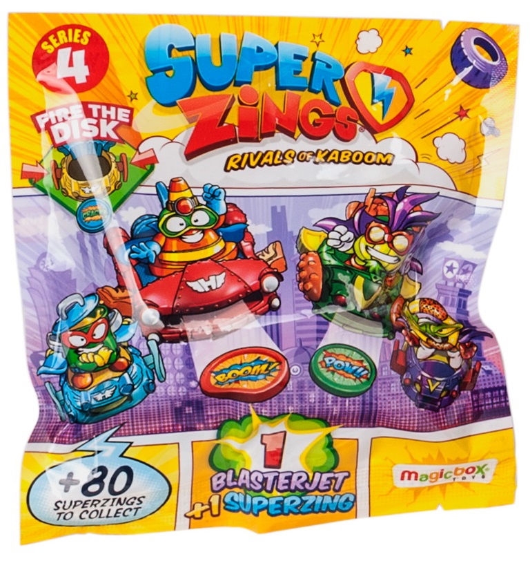 Noua colectie SuperZings Seria 4 include 8 BlasterJeturi, 4 modele in doua culori diferite fiecare. BlasterJeturile eroilor sunt vehicule „zburatoare” care protejeaza orasul Kaboom, iar blasterjeturile raufacatorilor ataca orasul Kaboom aruncand super discuri cu precizie. Exista 2 BlasterJeturi ale eroilor si 2 BlasterJeturi ale raufacatorilor pe care le poti colectiona. Salvarea sau distrugerea orasului Kaboom este in mainile tale! Oare poti descoperi toate blasterjeturile? Sunt cele mai cool vehicule din orasul Kaboom! Completeaza-ti intreaga colectie de blasterjeturi si conecteaza-le cu megajeturile pentru a le intensifica puterile.