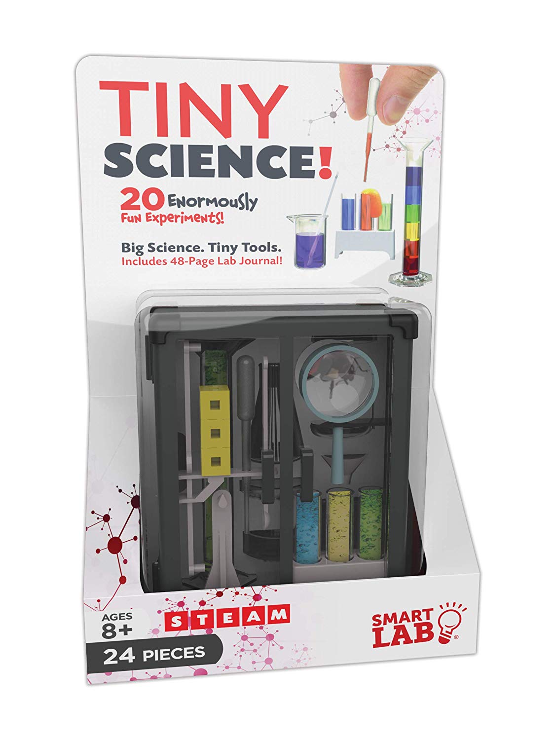Tiny tools—BIG Science! How small is the tiniest ball of slime you can make? Find out with this adorable miniature science lab that features precision lab instruments in a custom case. Mix up chemistry experiments in itty-bitty beakers. Peer at tiny specimens through the teeny-tiny magnifier. Weigh chocolate chips or a Cheerio on the tiny balance scale. The wonderfully small size makes it perfect for sleepovers or on-the-go science exploration adventures. The science activity book features 20 experiments that teach kids about acids and bases, CO2 production, microscopy, chemical reactions, polymers, non-Newtonian fluids, and more!