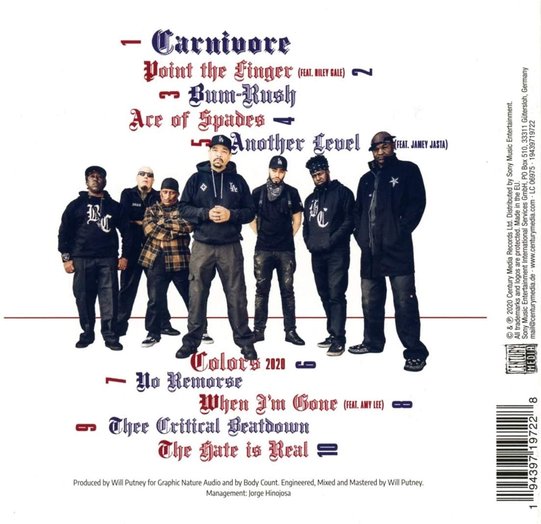 New album from metal icons BODY COUNT (feat. Ice-T). Follow up to their 2017 Grammy nominated album 'Bloodlust'The originators of RAP METAL are back! ICE-T and his gang are as angry as ever on their 7th studio album, which coincides with their 30th anniversary as a band! CARNIVORE, the band's second album for CENTURY MEDIA, continues the path of its uncompromising and critically acclaimed predecessors, "Bloodlust" (2017) and "Manslaugther" (2014), in pairing Ice-T's angry and socio-critical lyrics with thick guitar riffs and nods to metal and hardcore greats like Slayer, Metallica, Pantera, Suicidal Tendencies and Rage Against The Machine. Bangers like "Thee Critical Beatdown", "The Hate Is Real" and the title track will please old school Body Count fans, while "Colors" is a killer metal version of ICE-T's 1988 hit single of the same name. With Motorhead's classic "Ace Of Spades" Body Count are again paying tribute to one of their major musical influences. "When I'm Gone" shows a new side of Body Count and features guest vocals by Amy Lee (Evanescence). Other guest musicians include Dave Lombardo (ex-Slayer), Jamey Jasta (Hatebreed) and Riley Gale (Power Trip). The fantastic cover artwork is by Z. Bielak (Ghost)).