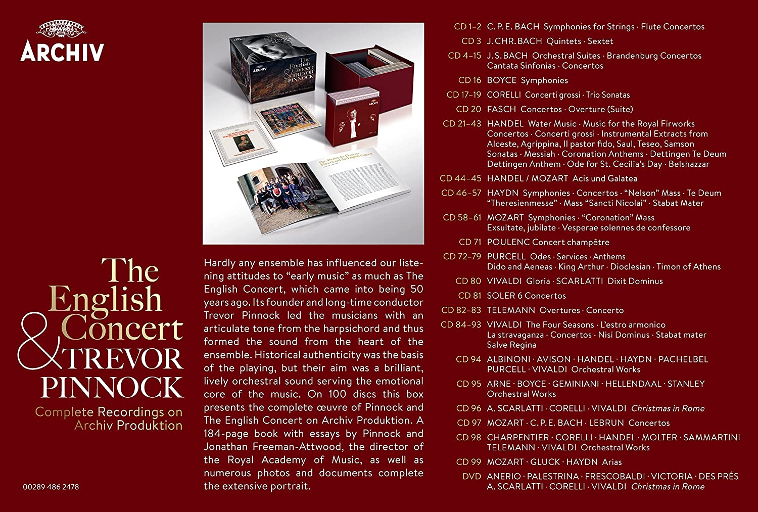 On the occasion of The English Concert's 50th birthday, the oeuvre of the renowned ensemble and it's founder and director Trevor Pinnock appears for the first time with a complete edition: on 99 CD and one DVD, from Purcell to Poulenc, in an Original Jackets Collection. From the seventies (Bach: Orchestral Suites) to the nineties (Handel: Music for the Royal Fireworks, 1749 version). 99CD/BR
