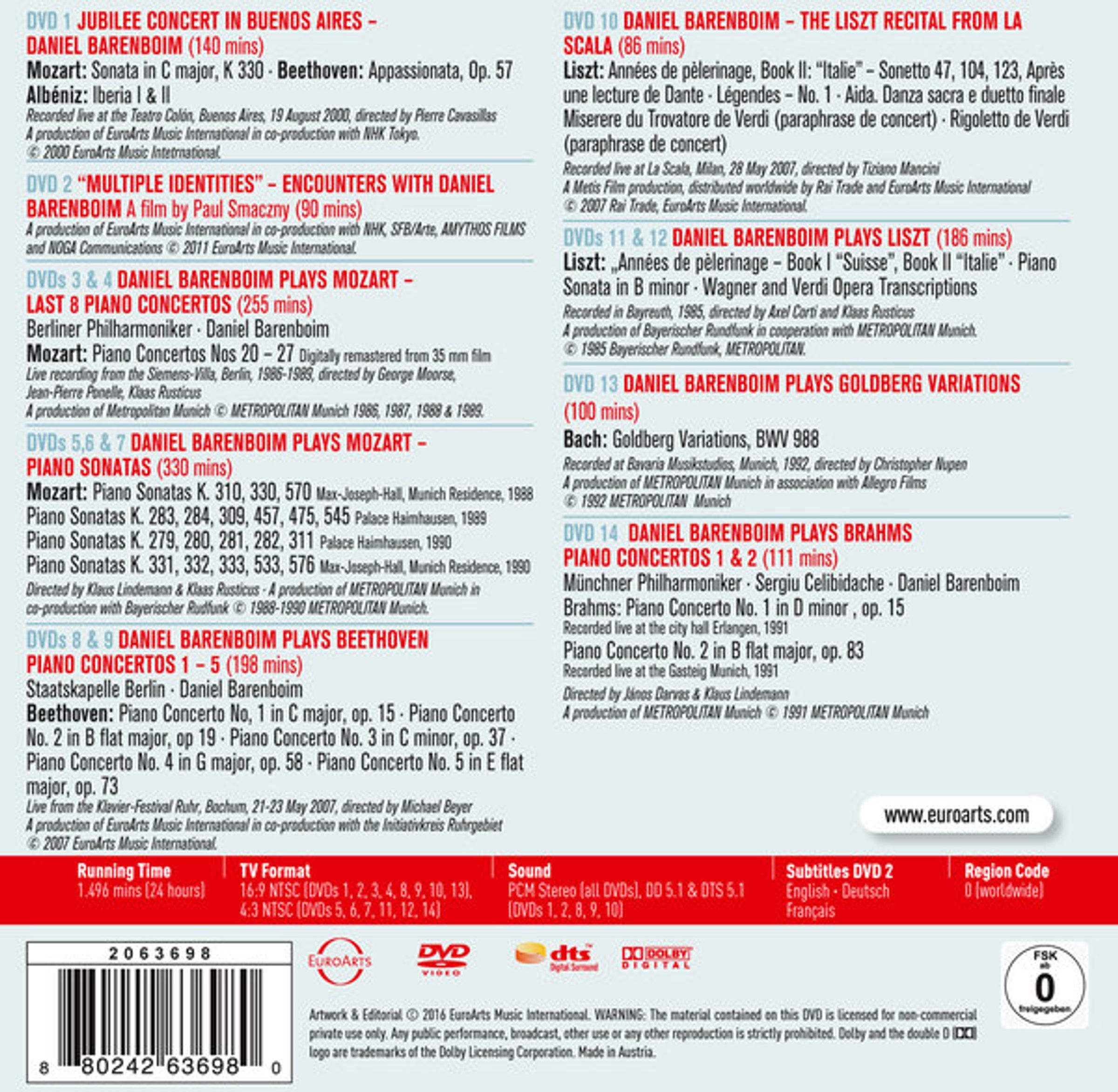 This comprehensive DVD edition about the pianist Daniel Barenboim includes legendary concerts such as the Liszt recital from La Scala in Milan, his interpretation of the Brahms piano concertos under the baton of Sergiu Celibidache, the Goldberg Variations, the Beethoven piano concertos 1-5 and the complete Mozart piano sonatas.