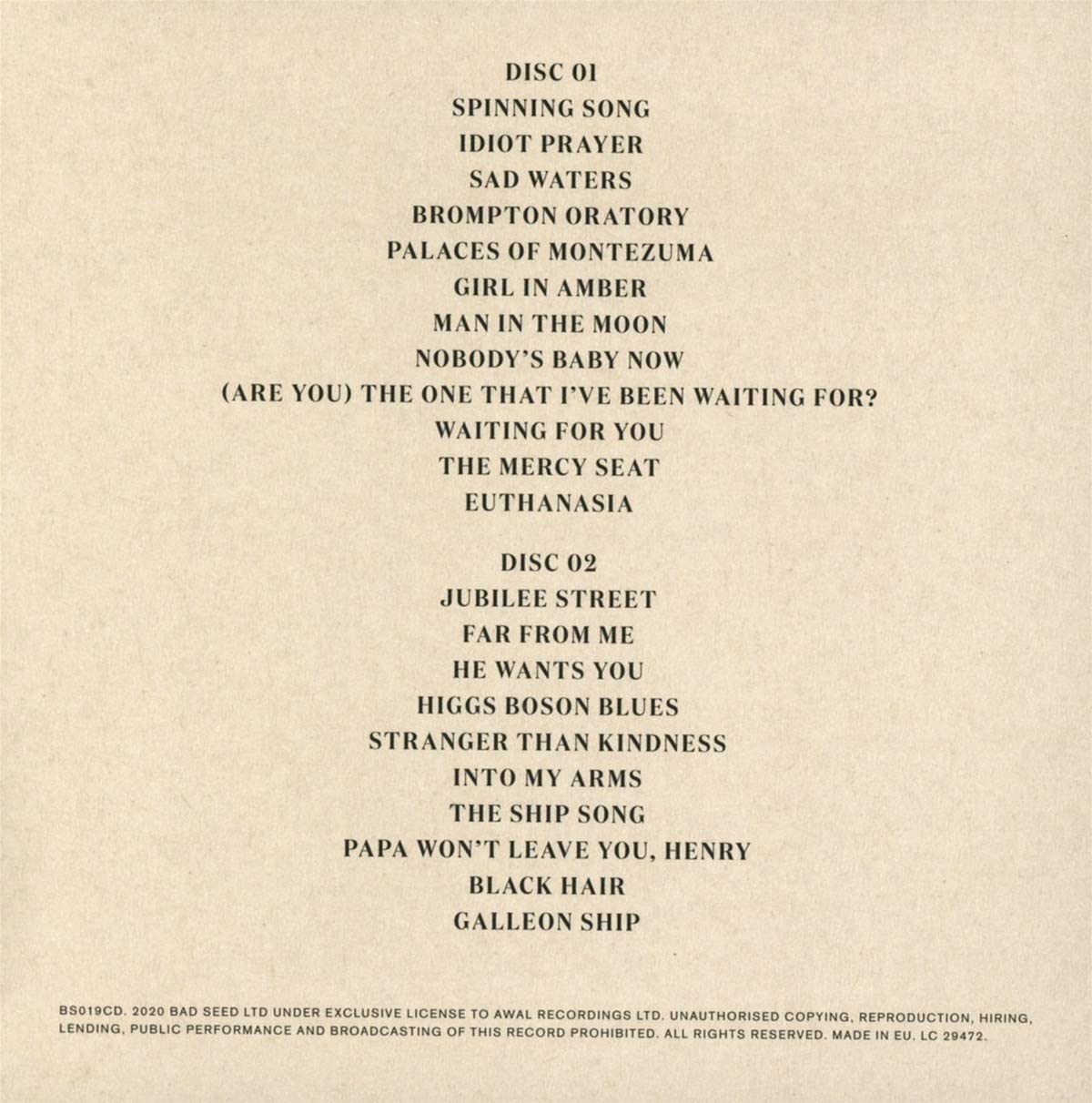 Two CDs. 2020 live release. Idiot Prayer: Nick Cave Alone at Alexandra Palace is a concert film and live album by musician Nick Cave. It was filmed by cinematographer Robbie Ryan and features Cave performing solo on piano at Alexandra Palace in London. Idiot Prayer serves as the final film in a trilogy-along with 20,000 Days on Earth (2014) and One More Time with Feeling (2016)-and was described by Cave as "it's luminous and heartfelt climax."