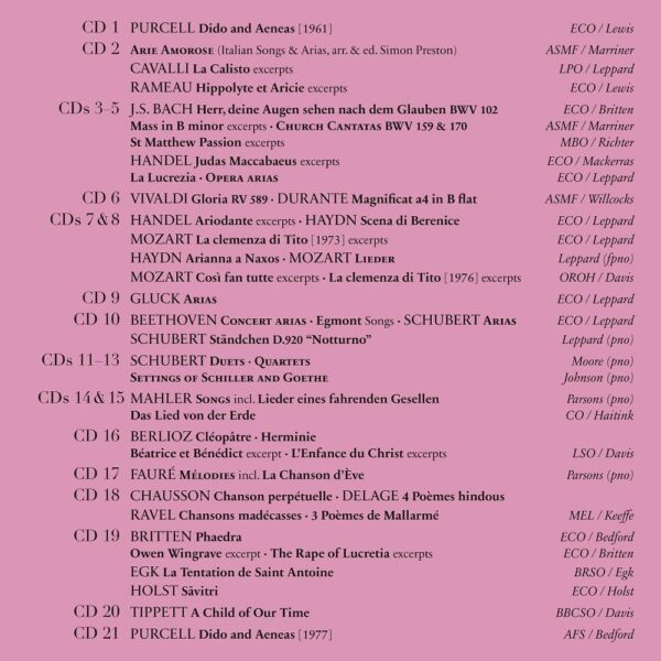 CD2 “Arie amorose” – Italian Songs & Arias by Giulio Caccini, Alessandro Stradella, Domenico Sarro, Antonio Cesti, Antonio Lotti, Alessandro Scarlatti, Antonio Caldara, Giovanni Bononcini, Franceso Durante, Giovanni Battista Pergolesi, Niccolo Piccinni, Giovanni Paisiello (Academy of St. Martin-in-the-Fields, Neville Marriner / 1978); Francesco Cavalli: 3 Scenes from La Calisto (Giovanni Faustini, James Bowman, London Philharmonic Orchestra, Raymond Leppard / 1971); Jean-Philippe Rameau: 2 Arias from Hippolyte et Aricie (English Chamber Orchestra, Anthony Lewis / 1965)