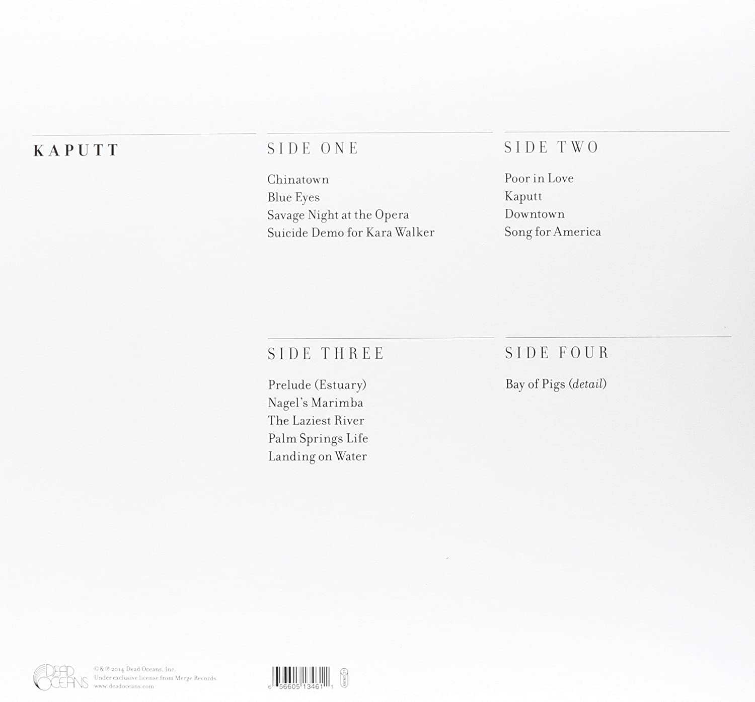 DESTROYER Kaputt (2014 UK & European limited edition double LP issue of their 2011 14-track album re-released exclusively for Record Store Day now pressed on White Vinyl expanded with the Side Three bonus recordings Prelude [Estuary] Nagels Marimba The Laziest River Palm Springs Life and Landing On Water (written largely by frequent Destroyer collaborator Ted Bois). Complete with the download code both discs appears in near as new condition housed in thegatefold picture sleeve which has the lyrics printed across the inside and retains its hype-stickered opened original shrinkwrap DOC046.