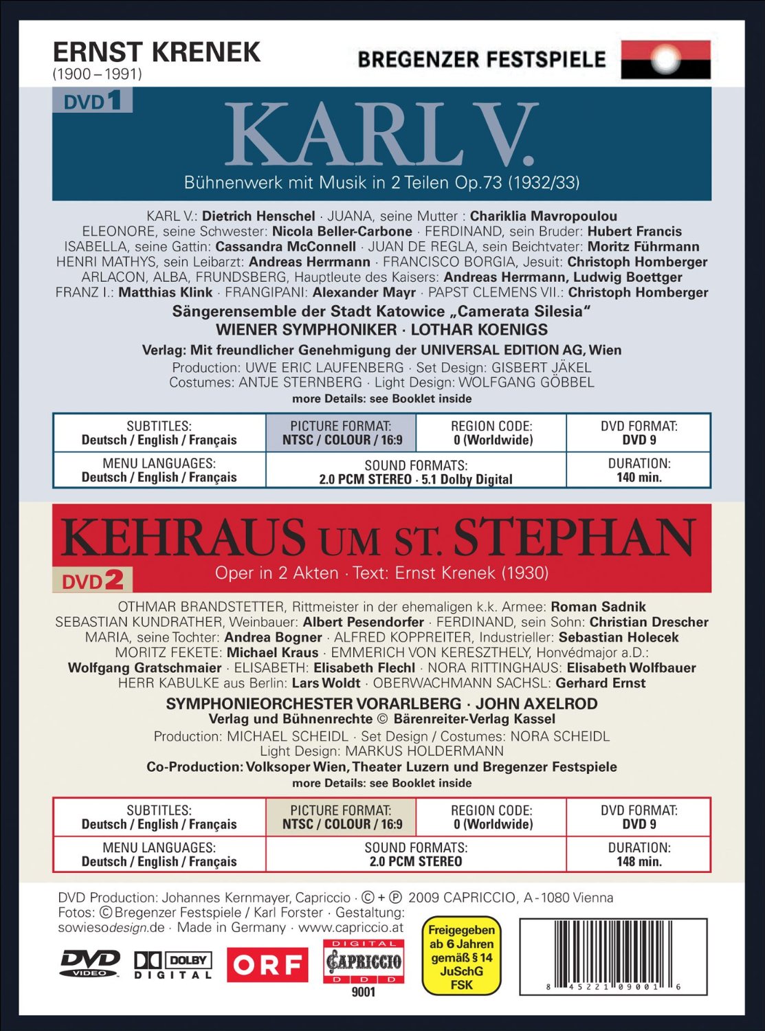 Karl V : Dietrich Henschel, Moritz Führmann, Nicola Beller-Carbone, Wiener Symphoniker, L. Koenigs, dir. - Kehraus um St. Stephan : Roman Sadnik, Albert Pesendorfer, Andrea Bogner, Sebastian Holecek, Symphonieorchester Vorarlberg, John Axelrod, dir.