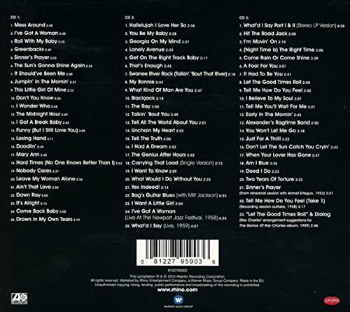 A music legend beyond compare, who almost single-handedly laid the groundwork for soul music, Ray Charles proved his mastery with countless jazz, country, R&B, and pop masterpieces, during a career that spanned seven decades. His musical genius is celebrated in this 3-CD set, covering his seminal time at Atlantic between 1952 and 59, as well as some unreleased material only available on the Genius Box Set, and a few classics from Ray’s own label.