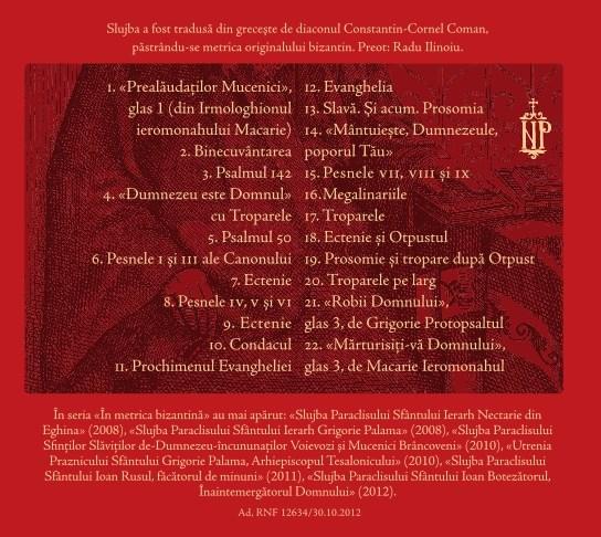 Sfântul Mina, ostaş al Imperiului Roman şi de fel din Egipt, a suferit moarte mucenicească la începutul secolului al IV-lea. Este unul dintre cei mai iubiţi sfinţi, cunoscut ca făcător de minuni şi grabnic ajutător al celor păgubiţi. Paraclisul său a fost tradus din greceşte de diaconul Constantin-Cornel Coman, păstrându-se metrica originalului bizantin.