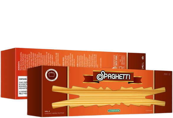 During their sold-out world tour 'EASY-CRAZY-HOT' LE SSERAFIM (KIM CHAEWON, SAKURA, HUH YUNJIN, KAZUHA & HONG EUNCHAE) release their 1st Single Album titled 'SPAGHETTI' - available on 3 versions: 'WEIRD GARLIC', 'KNOCKING BASIL', 'CHEEKY NEON PEPPER'.