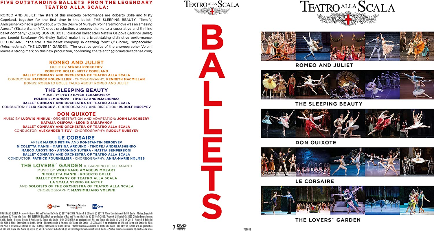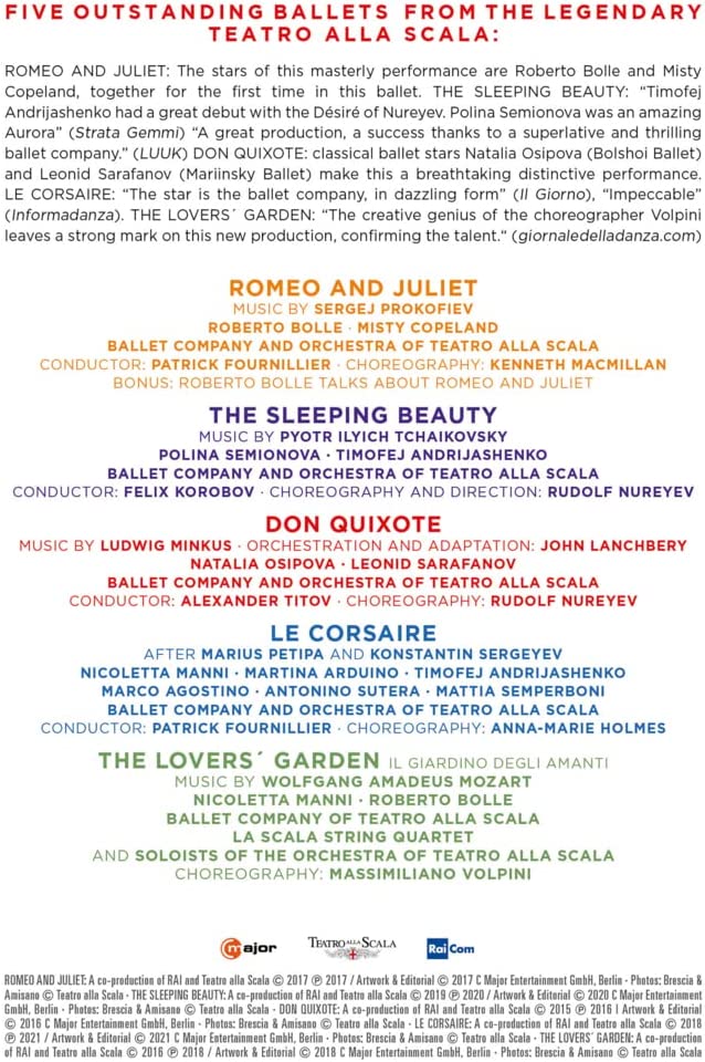 FIVE OUTSTANDING BALLETS FROM THE LEGENDARY TEATRO ALLA SCALA: ROMEO AND JULIET: The stars of this masterly performance are Roberto Bolle and Misty Copeland, together for the first time in this ballet. THE SLEEPING BEAUTY: 'Timofej Andrijashenko had a great debut with the Désiré of Nureyev. Polina Semionova was an amazing Aurora' (Strata Gemmi) 'A great production, a success thanks to a superlative and thrilling ballet company.' (LUUK) DON QUIXOTE: classical ballet stars Natalia Osipova (Bolshoi Ballet) and Leonid Sarafanov (Mariinsky Ballet) make this a breathtaking distinctive performance. LE CORSAIRE: 'The star is the ballet company, in dazzling form' (Il Giorno), 'Impeccable' (Informadanza). THE LOVER´S GARDEN: 'The creative genius of the choreographer Volpini leaves a strong mark on this new production, confirming the talent.'