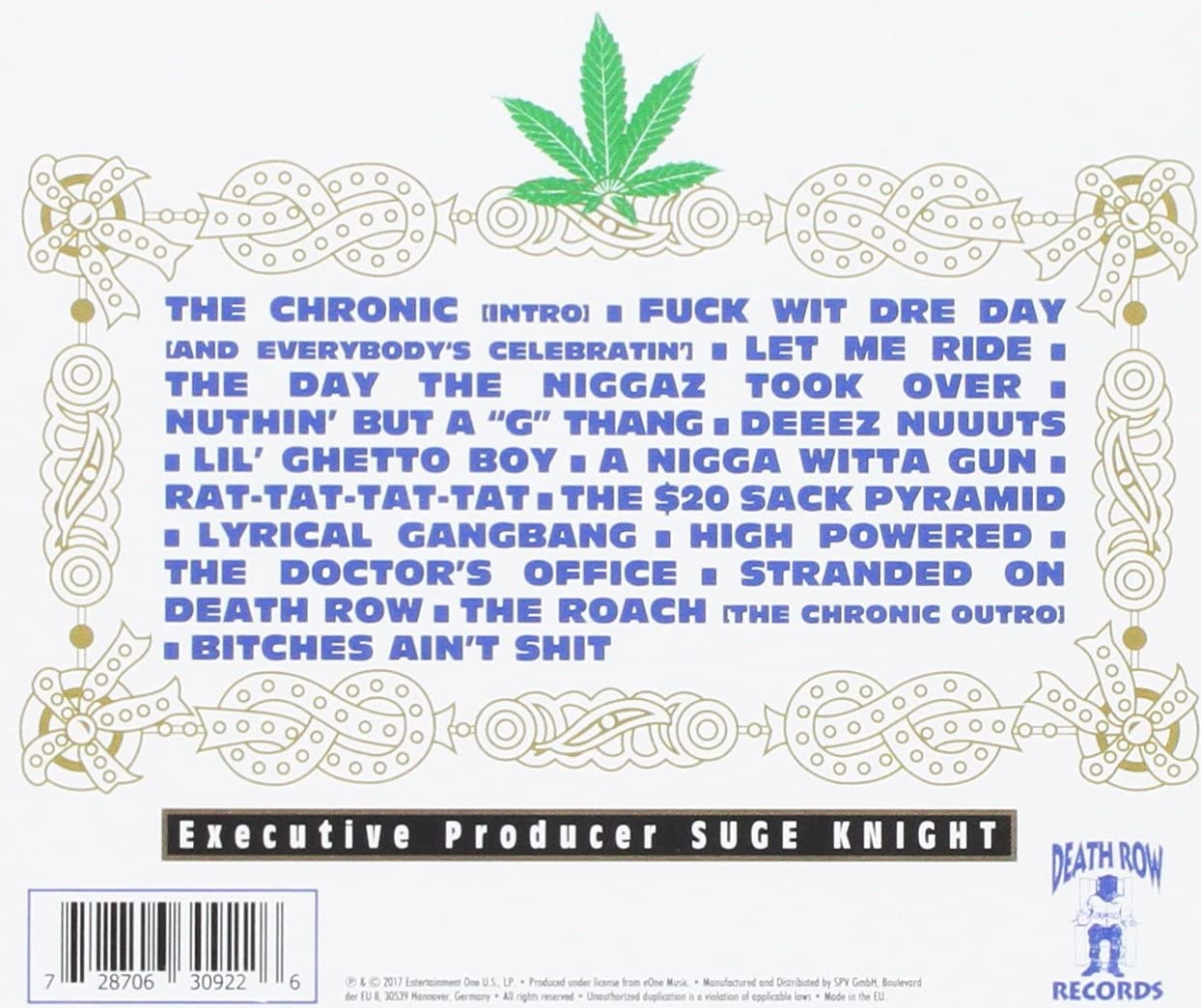 The Chronic is the debut studio album by American hip hop producer and rapper Dr. Dre. It was released on December 15, 1992, by his own record label Death Row Records and distributed by Interscope Records. Recording sessions for the album took place in June 1992 at Death Row Studios in Los Angeles and at Bernie Grundman Mastering in Hollywood. The album is named after a slang term for high-grade cannabis, and its cover is an homage to Zig-Zag rolling papers. It was Dr. Dre's first solo album after he had departed from hip hop group N.W.A and its label Ruthless Records over a financial dispute.