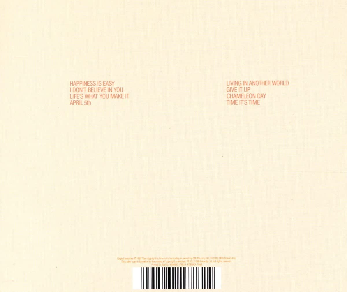 Out of print in the U.S.! Reissue of the British trio's third album, originally released in 1986. Features the hit 'Life's What You Make It' and the U.K. singles 'Living in Another World' and 'Give It Up'. EMI. 2012.