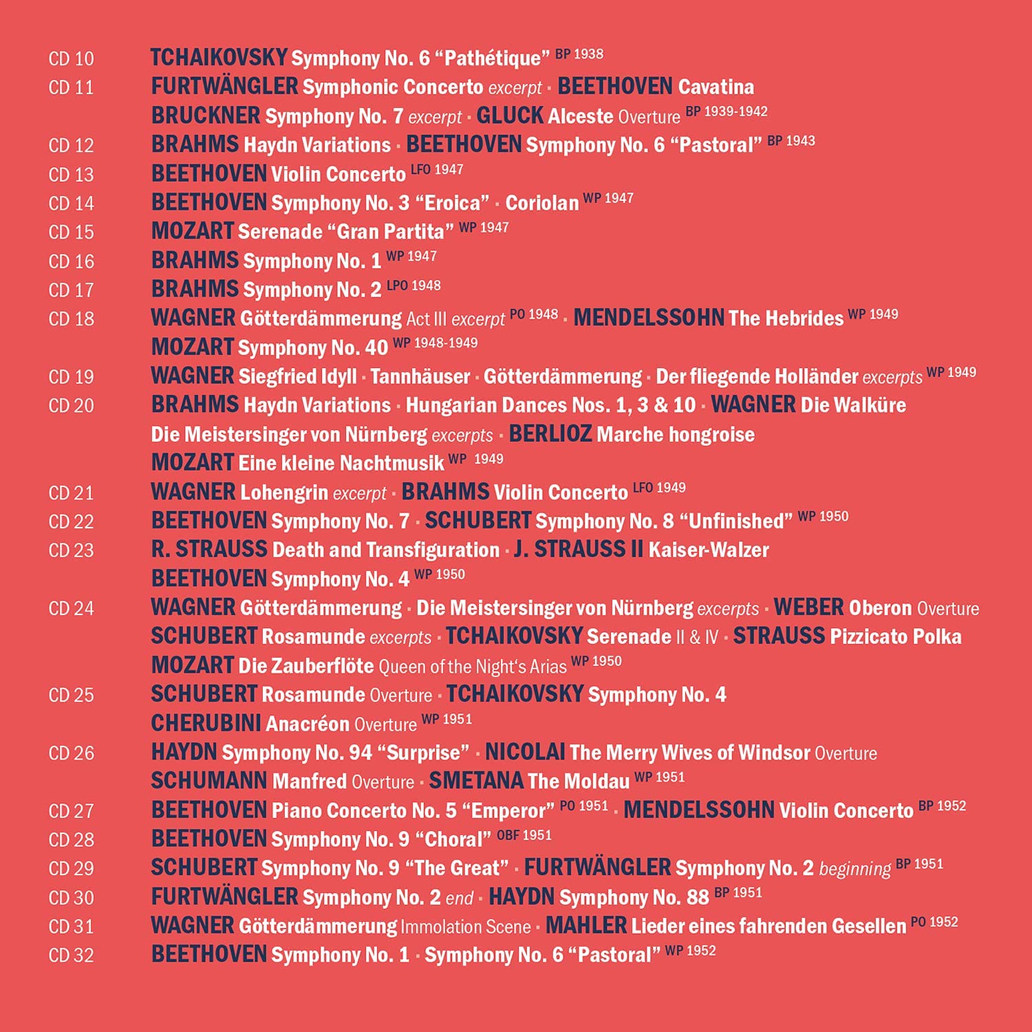 Beethoven Symphonies Nos. 1, 3-9 (No. 5 in three versions; No. 3, 4, 6, 9 in two versions); Violin Concerto op. 61 (in two versions); Romanzen No. 1 & 2 for Violin & Orchestra; Piano Concerto No. 5; Egmont-Overture op. 84; Cavatina for String Orchestra from String Quartet No. 13); Coriolan-Overture op. 62; Leonore Overture No. 2; Fidelio (Complete recording from 1953)