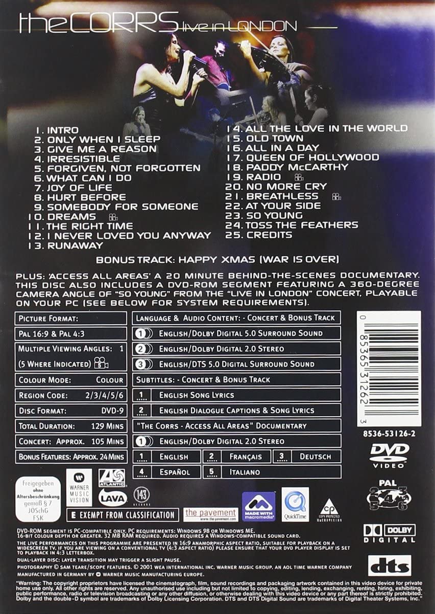 The Corrs--Live in London lacks the atmosphere of their 1999 homecoming Dublin gig, Live at Lansdowne Road. The London stadium location creates a sterile atmosphere and adds an uncomfortable, claustrophobic edge to their performance. That aside, the concert once again affirms their position as one of the best live acts around and resolutely challenges the assumption that studio recordings are always better than the live versions. Perhaps this is why it was decided to release another Corrs live show rather than a greatest hits video collection to coincide with the launch of their Best of audio anthology. Hearing and viewing their stunning performance of tracks such as "Forgiven, Not Forgotten" and "Dreams", it's easy to understand why the band still has such universal appeal.