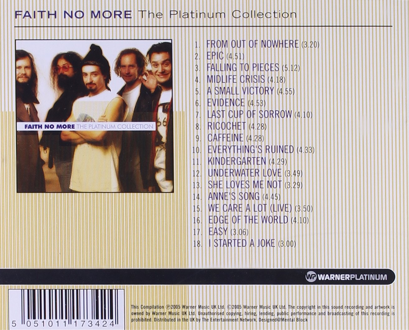 18 track Platinum Collection consists of the best from the Warner/Elektra music archives. With their fusion of heavy metal, funk, hip-hop, and progressive rock, Faith No More has earned a substantial cult following. By the time they recorded their first album in 1985, the band had already had a string of lead vocalists, including Courtney Love; their debut, We Care a Lot, featured Chuck Mosley's abrasive vocals but was driven by Jim Martin's metallic guitar. 2005.