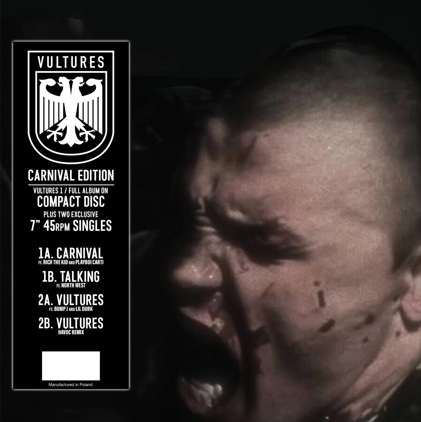 The groundbreaking 2024 album VULTURES 1 by supergroup ¥$ (Ye and Ty Dolla $ign) brought celebratory, reunion-like energy to the music world. Featuring the GRAMMY-NOMINATED track “Carnival” (nominated for Best Rap Song in 2025), the album fuses Ye’s iconic soul-sample rap and lo- electro stylings with Ty Dolla’s e‑ ortlessly smooth vocals. The result is an unpredictable, dynamic listening experience that topped streaming charts in 72 countries and debuted at number one on the Billboard 200. Now, fans can celebrate with the special Carnival Edition 7-inch vinyl. This collector’s release features a stunning gatefold cover with exclusive artwork showcasing pictures from the iconic music video for the song „Carnival.“ The vinyl includes standout tracks “Vultures,” the exclusive “Vultures – Havoc Remix” (not available on any other physical format), “Talking” featuring Ye’s daughter North West, and “Carnival” with Rich The Kid and Playboi Carti. The package also comes with the full album on CD, making it the ultimate collector’s item for VULTURES 1 enthusiasts.