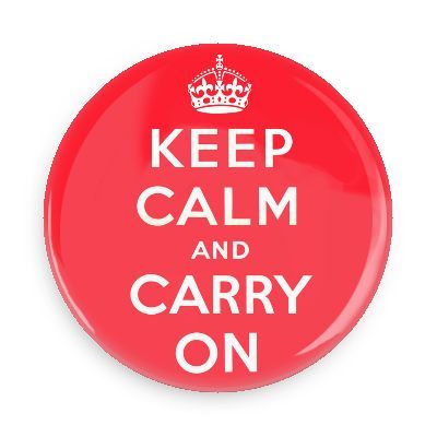O frumoasa insigna rosie stralucitoare, cu cuvintele „Keep Calm and Carry On” cu majuscule albe sub un logo al coroanei.