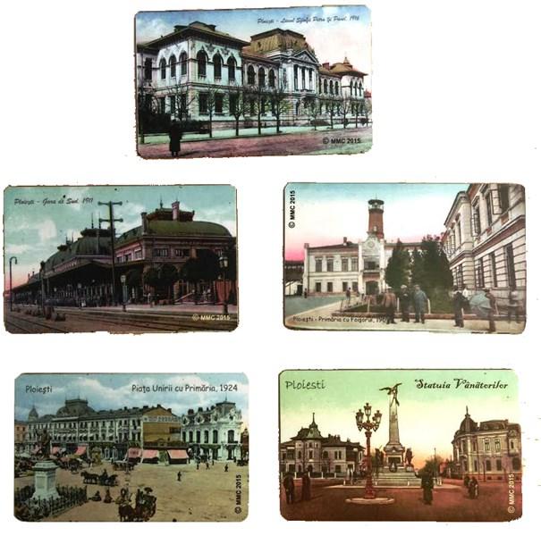 Magneti cu Ploiesti in 5 reproduceri cu cele mai importante locuri, monumente si cladiri ale orasului Ploiesti: Gara de Sud-1911, Bustul lui Radu Stanian (1840-1897), primar al Ploieştiului, Liceul Sfinţii Petru şi Pavel, 1891-1943, Piata Unirii in fata Primariei, Statuia Vanatorilor si Observatorul de incendiu cu Foisorul 1907.
