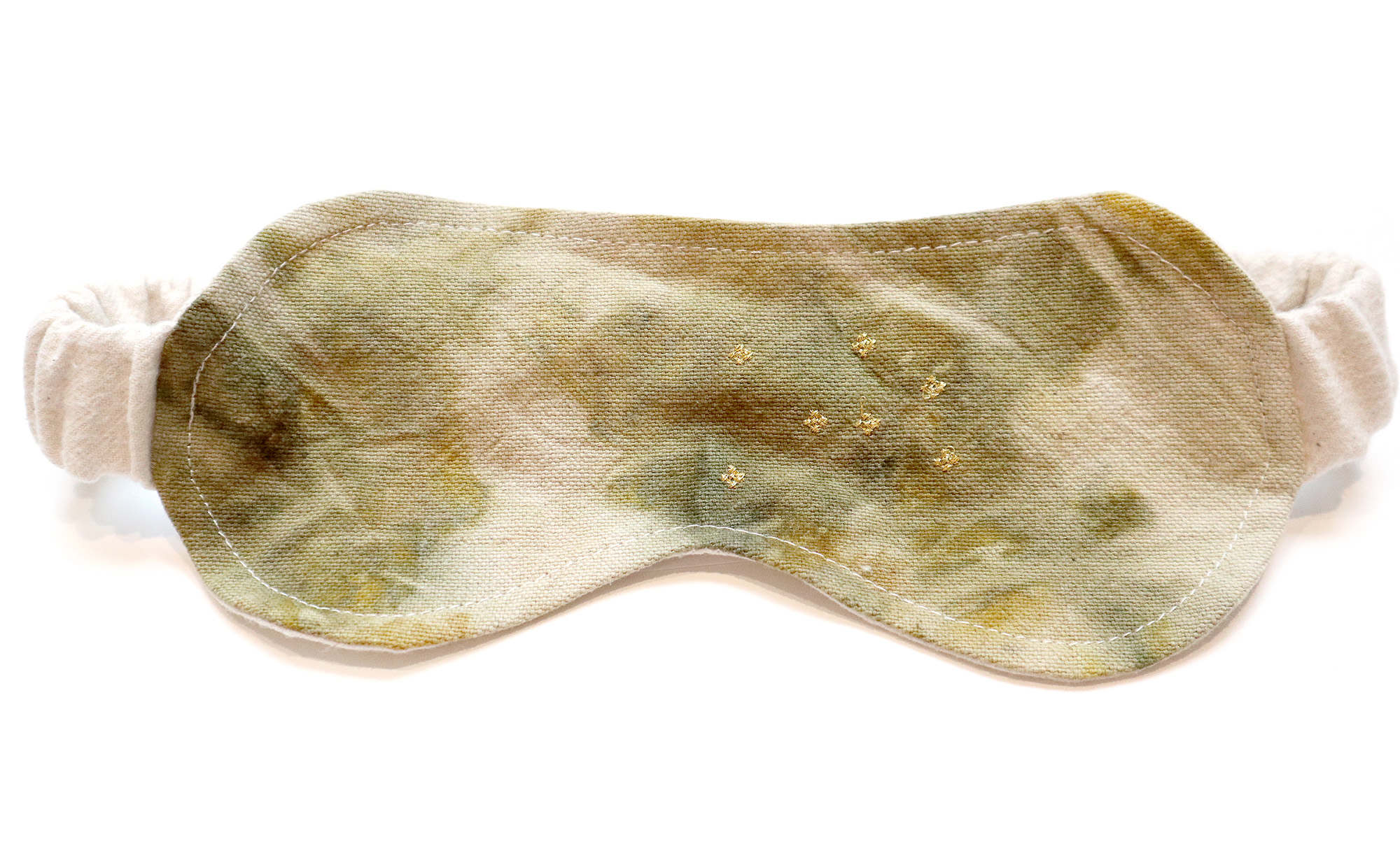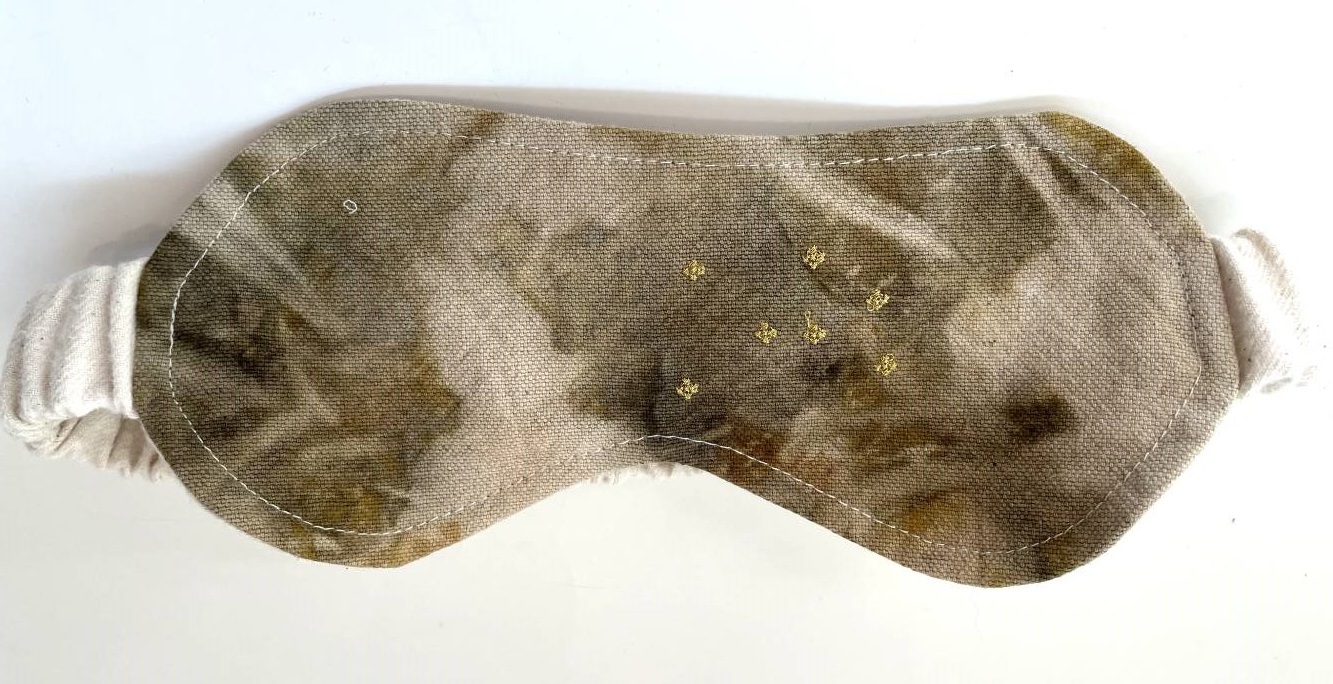 Mască realizată din material natural, in, vopsită natural din frunze și plante cu broderie aurie. Pentru un somn liniștitor.