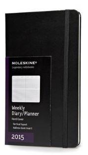 The 2015 Moleskine Weekly Large Vertical Diary is bound in a black hardcover with rounded corners and a black elastic closure and includes a monthly planner on 12 pages. The 144 pages are thread bound acid-free paper and the diary includes an expandable inner pocket, a removable 28-page address book with laminated labels, a ribbon placeholder and a removable card with the history of Moleskine. The vertical diary shows the whole week on two pages in column format, for at-a-glance use.