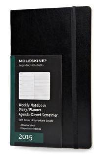 Moleskine's large format 12-month weekly 2015 diary features a black soft cover with rounded edges, a ribbon bookmark and an elastic enclosure to keep everything secure when closed. It also includes 144 acid-free pages and an expandable inner pocket with 225 adhesive labels to mark important dates and deadlines. The week at a glance is shown on the left, while the right side contains a lined area for extra notes and ideas.