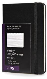 The 2015 Moleskine Weekly Pocket Vertical Diary is bound in a black hardcover with rounded corners and a black elastic closure and includes a monthly planner on 12 pages. The 144 pages are thread bound acid-free paper and the diary includes an expandable inner pocket, a removable 28-page address book with laminated labels, a ribbon placeholder and a removable card with the history of Moleskine. The vertical diary shows the whole week on two pages in column format, for at-a-glance use.