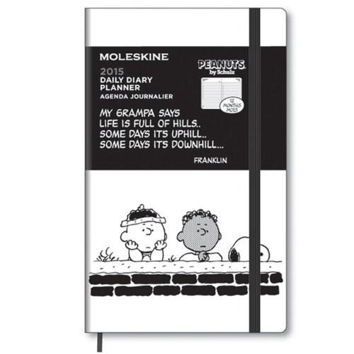Moleskine's Peanuts Limited Edition large format daily 2015 diary celebrates Charles Schulz's iconic comic strip. The white, hard cover and themed flyleaves feature silkscreen images of Peanuts characters. The diary includes themed stickers, 400 pages of acid-free thread bound paper, an expandable inner pocket and a ribbon bookmark. Presented with a new page for each day.