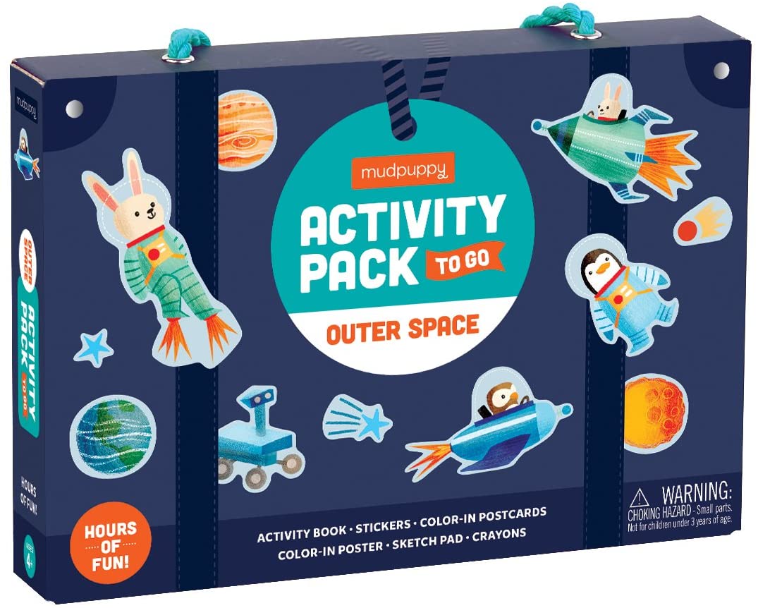 Mudpuppy's Activity Packs To Go contain 3 color-in postcards, over 20 stickers, sketch pad, activity book, color-in poster, and 5 crayons!