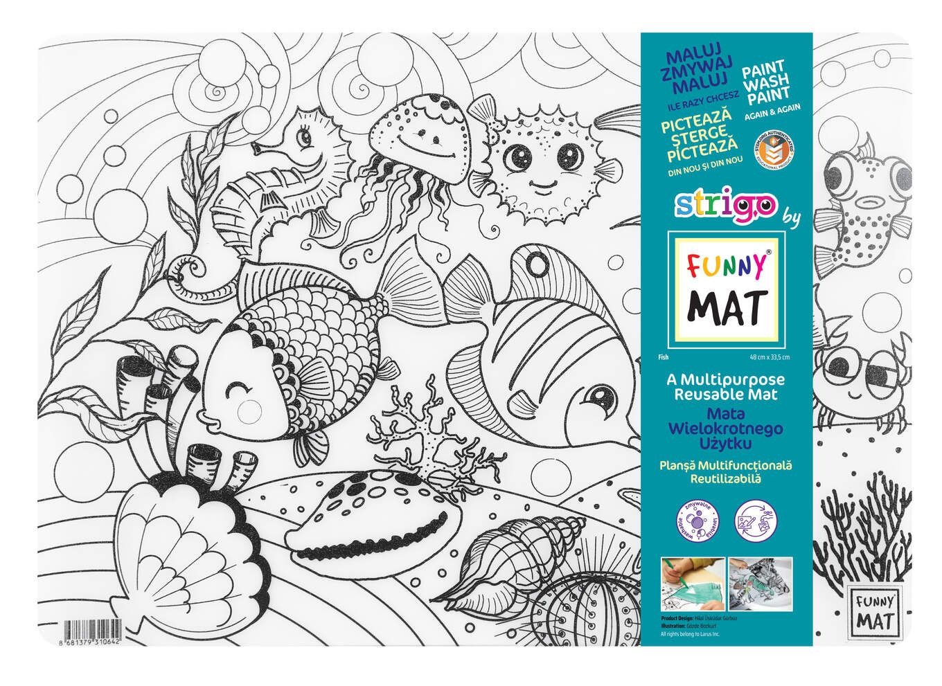 Funny Mat "Pestisori" de la Strigo este un covoraș transparent, impermeabil și reutilizabil, conceput pentru a proteja suprafețele în timpul activităților creative ale copiilor.