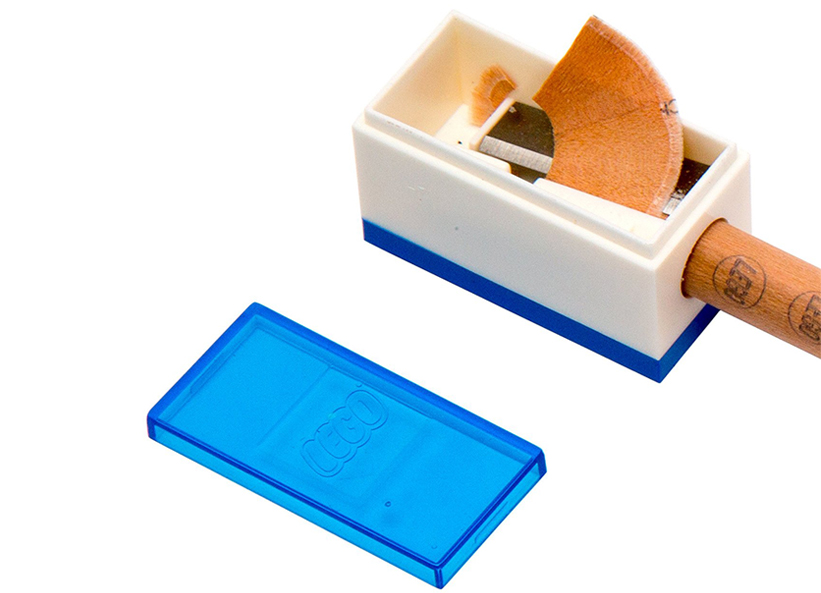 Ascutitoarea are incorporata o placa LEGO adevarata in partea de jos iar placa neteda LEGO este in loc de capac.