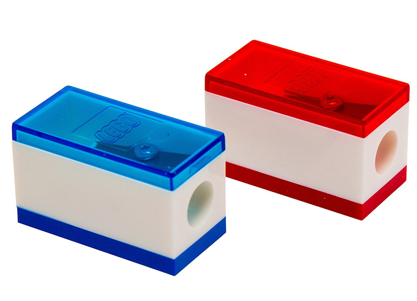 Setul contine 2 ascutitoare LEGO colorate (rosu si albastru).
