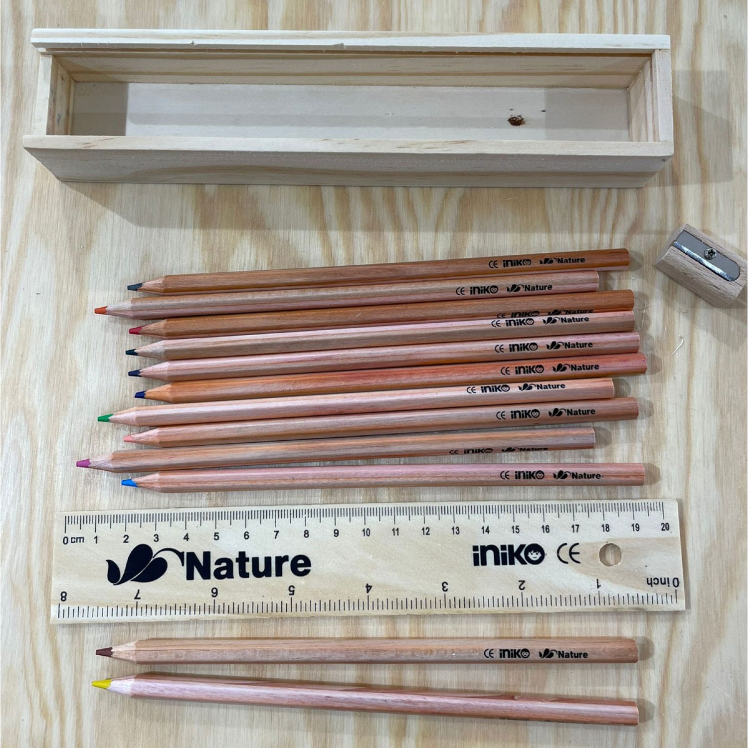 Set 12 Creioane colorate, rigla, ascutitoare, cutie depozitare, INIKO