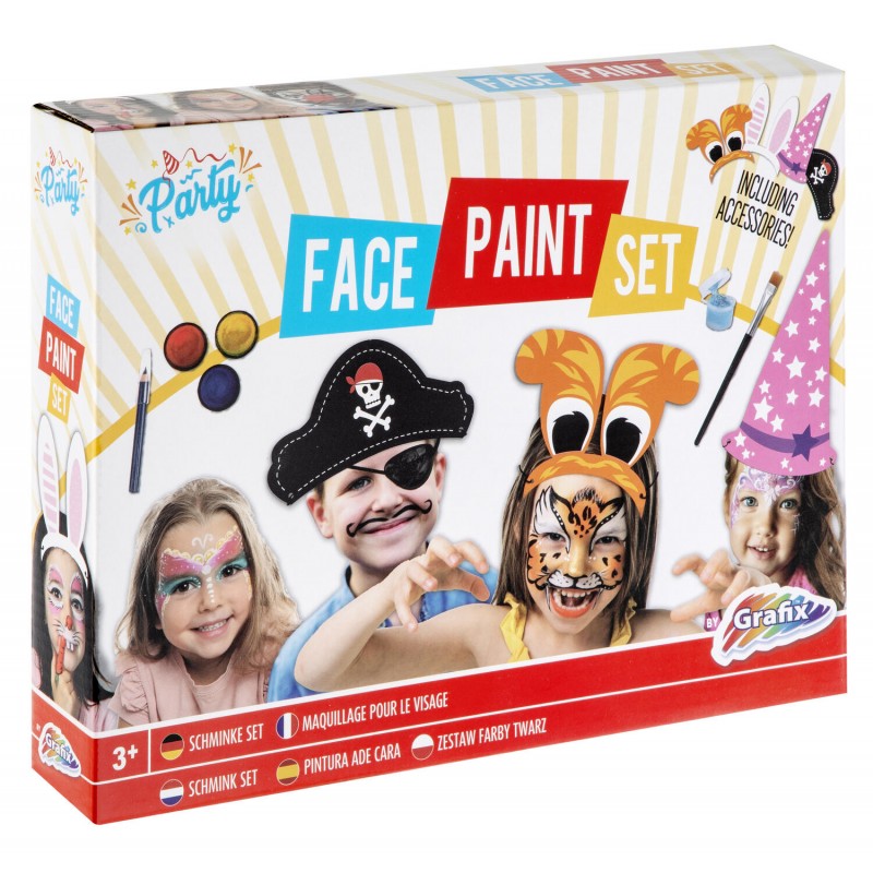 Un set de pictura pe fata potrivit pentru orice ocazie: petrecere, zile de nastere sau evenimente in aer liber. Caracteristici: setul dezvolta creativitate si indemanare daca vrei sa fi un suporter adevarat picteaza-te pe fata in culorile echipei favorite vopseaua se curata cu usurinta de pe fata cu apa si sapun Setul include: 6 capsule mici cu vopsea (galben, mov, verde, negru, rosu, galben) o capsula mare cu vopsea alba 4 creioane machiaj (negru, albastru, maro, rosu) 2 pensule 2 recipiente cu sclipici 2 bureti rotunzi elastic pentru prinderea accesoriilor pe cap o folie din plastic stantata cu diverse decoratiuni pentru fata 4 coli decupate din carton A4 pentru accesorii de prins pe cap (2 x palarie si 2 x urechiuse animalute) un burete triunghiular accesorii instructiuni Varsta recomandata: 3 ani+ Atentie! Contraindicat copiilor mai mici de 3 ani. Jucaria/produsul poate contine piese mici care se pot inghiti sau inhala existand pericolul de sufocare sau nu este potrivita copiilor mai mici de 3 ani. Nu lasati ambalajele jucariilor/produselor la indemana copiilor. Indepartati orice ambalaj al jucariei/produsului inainte de a da jucaria/produsul copilului. Va rugam sa supravegheati copilul in timp ce se joaca/foloseste acest produs. Pastrati instructiunile si etichetele pentru referinte viitoare. Pastrati jucaria/produsul departe de foc, feriti jucaria/produsul de temperaturi ridicate si umiditate.