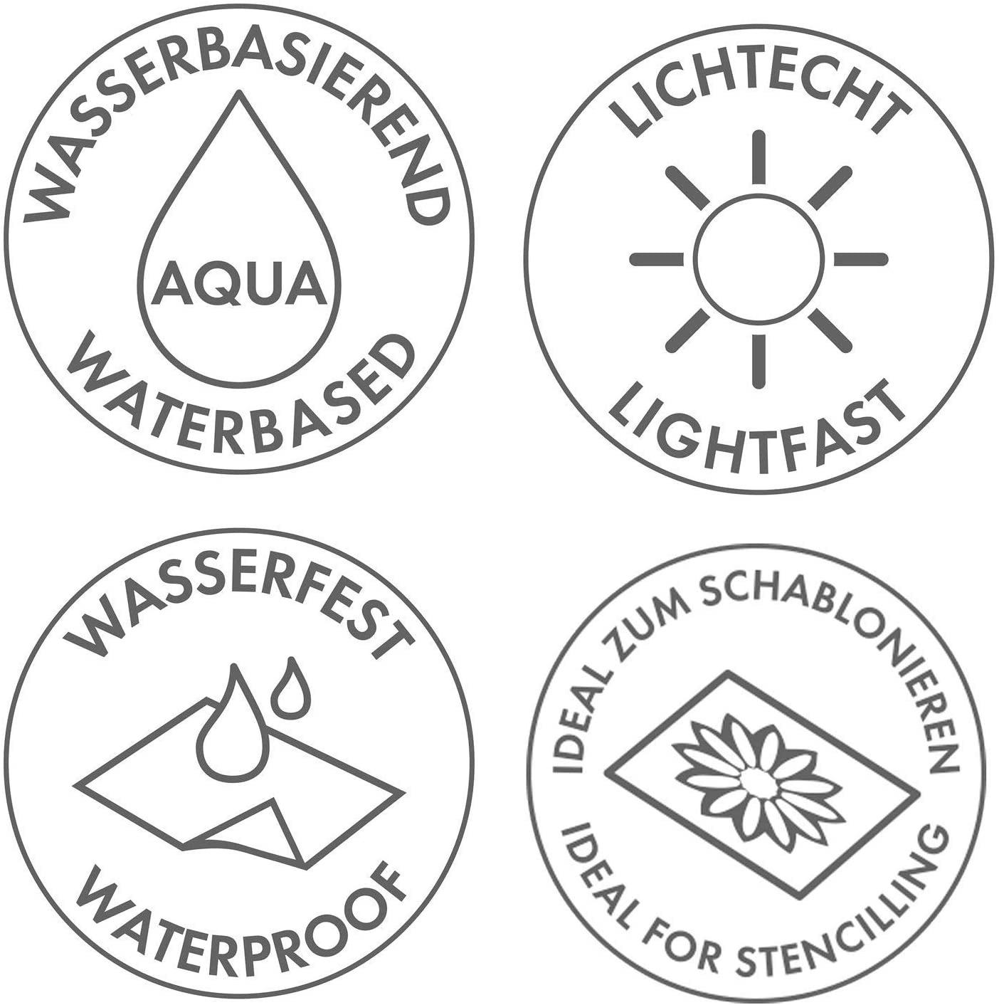 Culorile se pot combina între ele, pot fi diluate cu apă, uscarea este rapidă, sunt rezistente la lumină și apă.