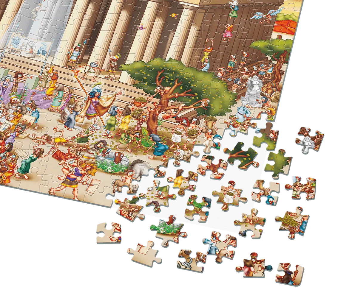 Multitudinea de personaje crește gradul de dificultate al jocului puzzle, dar cum toate sunt atât de simpatice și puse pe șotii, este o delectare să le descoperi jocul. O scenă dinamică, plină de culoare și o abordare îndrăzneață a unui subiect interesant este ceea ce găsești în puzzle 1000 piese Acropolis.