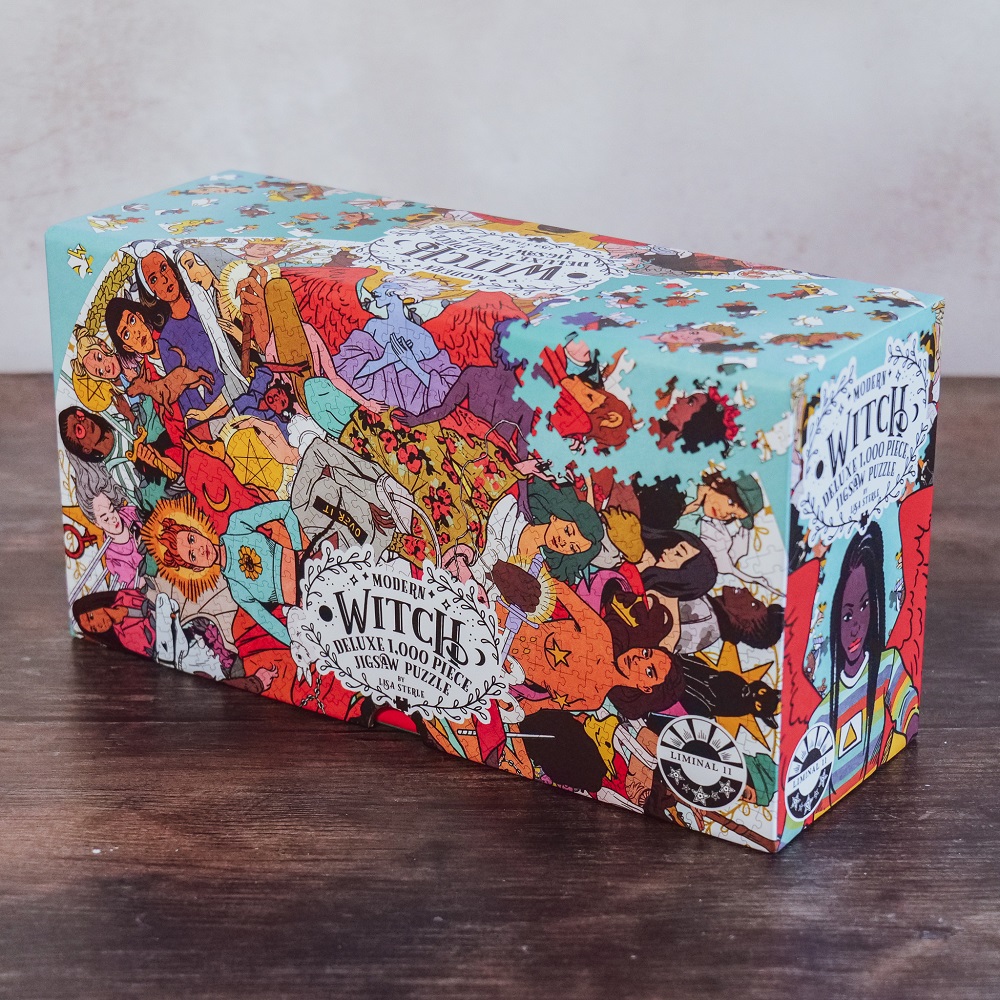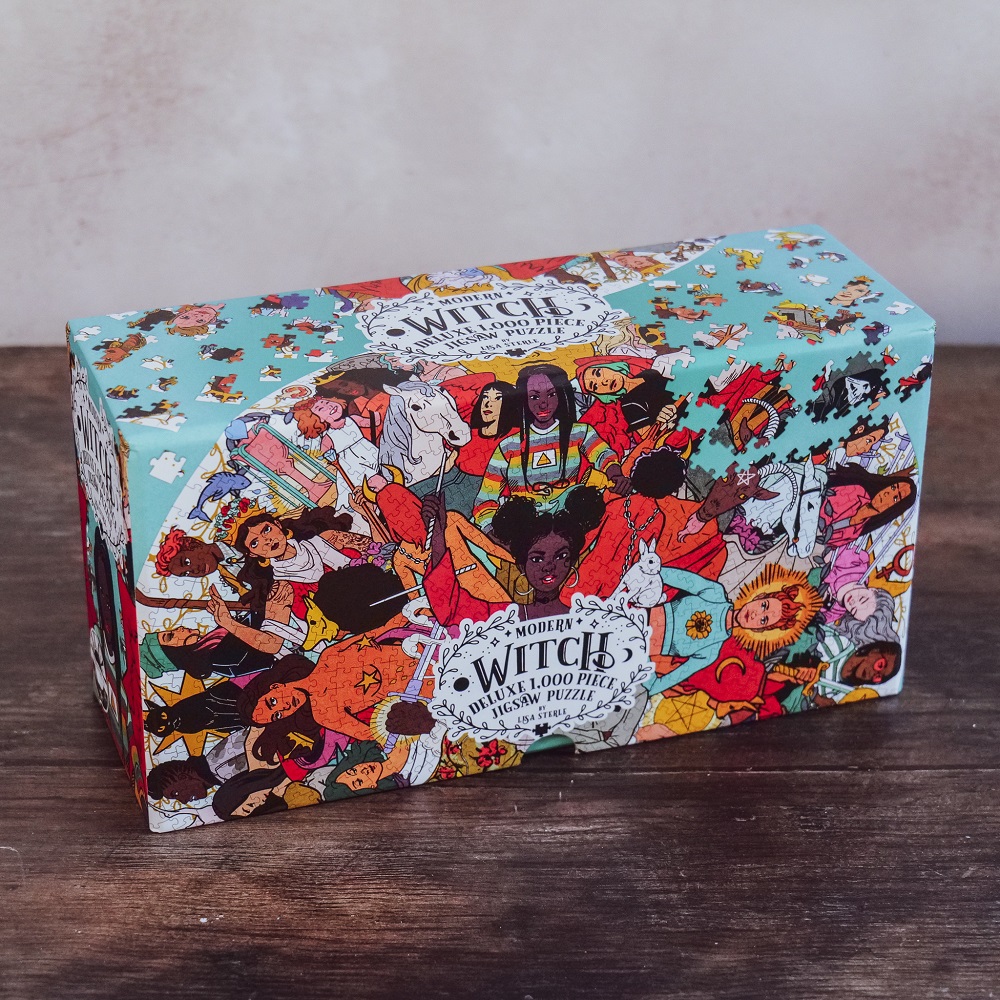 Puzzle Modern Witch Tarot în formă de cerc cu 1000 de piese cu o ilustrație a artistei Lisa Sterle.