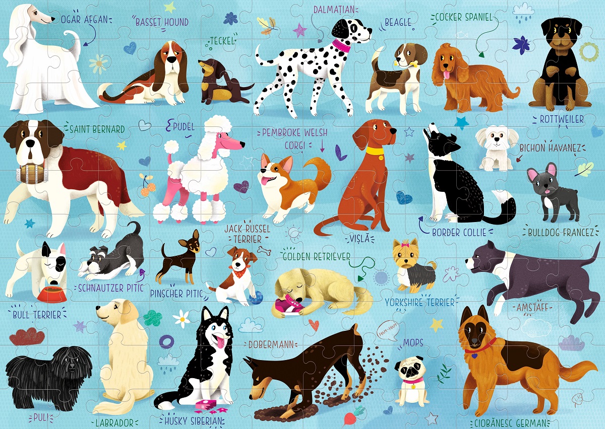 Puzzle 120 piese: Lumea cainilor. Puzzle + carte + stickere