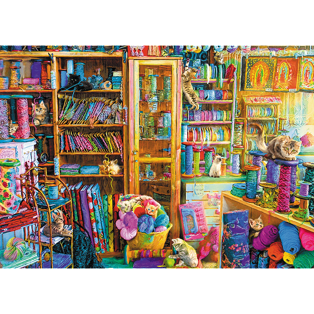 Puzzle din 2000 de piese care prezintă o încăpere colorată plină de pisici.