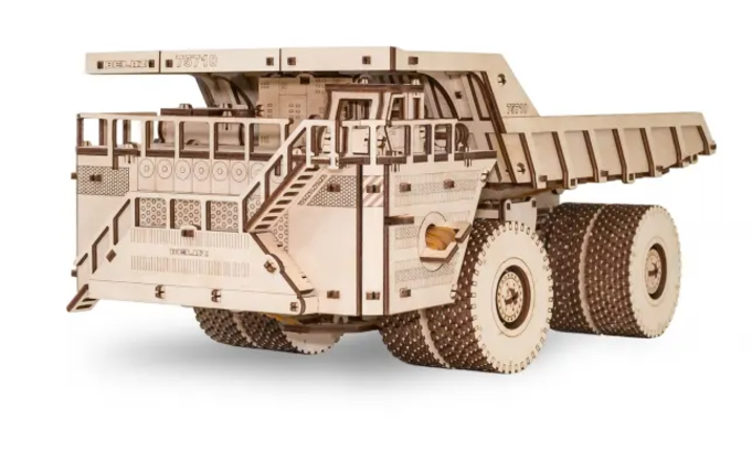 Puzzle-ul mecanic 3D al celui mai mare camion greu din lume – BELAZ 75710. Modelul este echipat cu motor cu bandă de cauciuc și roți rotative care transformă modelul într-o camion mobil.