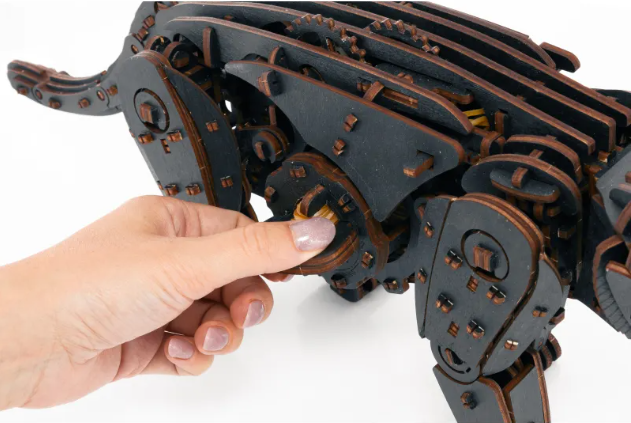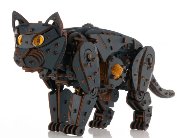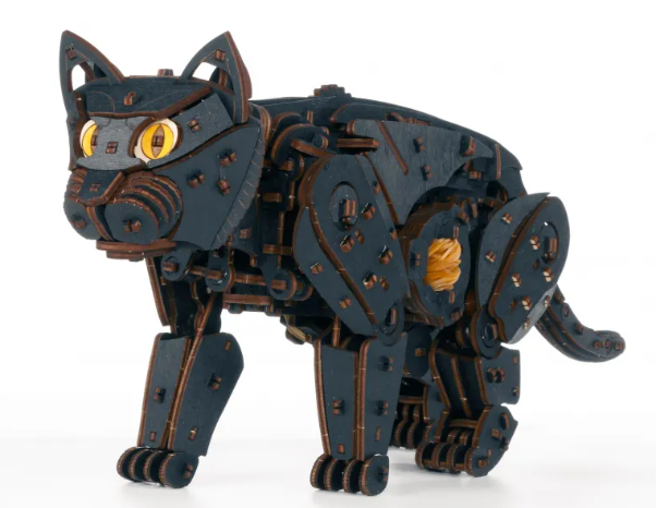 Puzzle mecanic 3D cu motor cu bandă de cauciuc al unei pisici care se plimbă cu mecanism de pornire/oprire și coadă flexibilă.