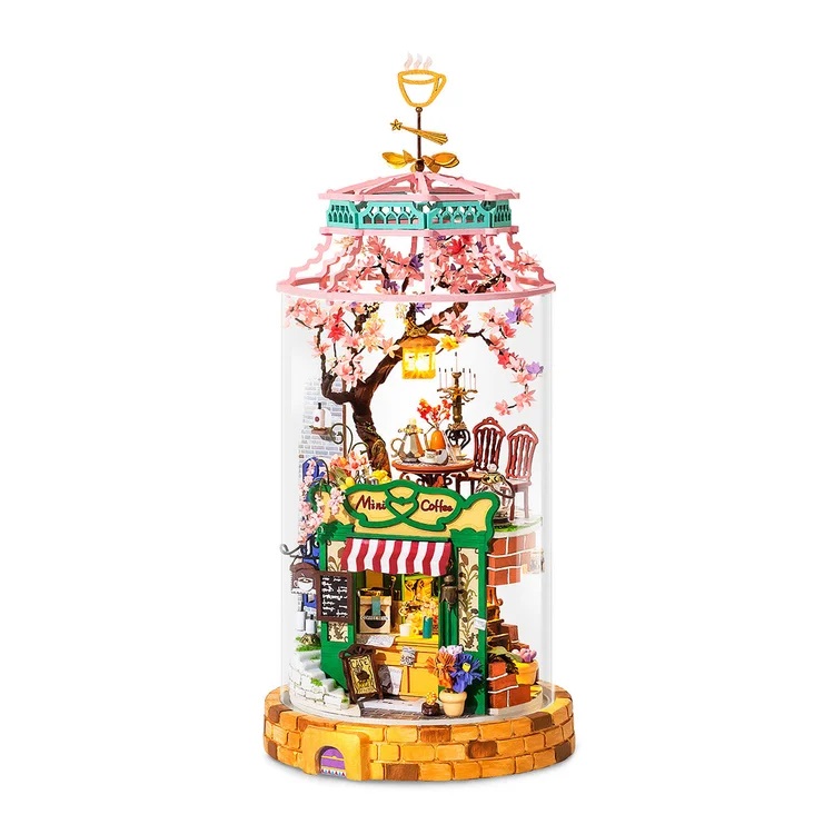 Construiește o mini cafenea de vis! Acest kit DIY include nu doar toate piesele și instrumentele de bricolaj, ci și cupola acrilică pentru un display cu efect.